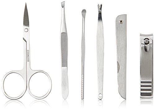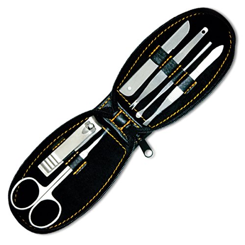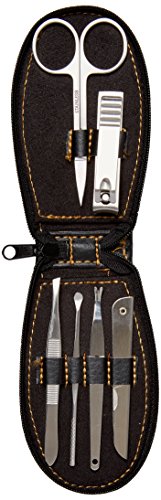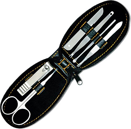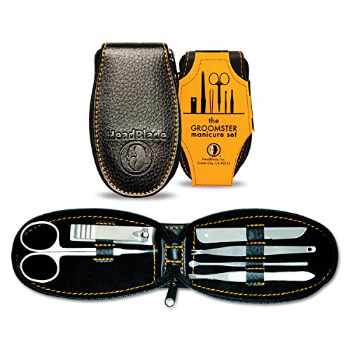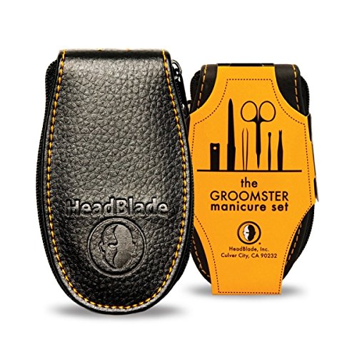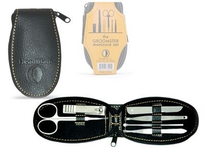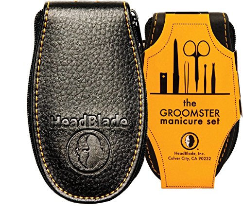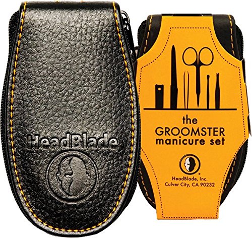 Welcome to HeadBlade world. Sure, they don't have HeadBlade "everything" but we all do need to keep our nails looking good (or at least clean). The Groomster, a very tasteful, and great quality set, contains clippers that really clip, a file that really files, and scissors that really...hmmm...cut (scis isn't a word); you get the point. And yeah, there's this odd shaped tool (cuticle cleaner) that has a "v" shape at the end. It's for cutting cuticles and boy, is it sharp. Really sharp. Like cutting through butter. The last utensil is an ear cleaner. Just because. Embossed leather-like material with zipper closure. This thing is ready to travel. 0