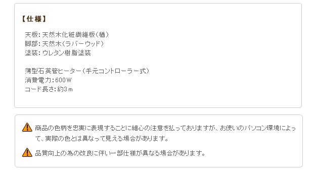 ●商品について:角が丸く優しさあふれるシンプルなデザイン。こたつもテーブルもこれ1台でOK♪使わないときは折畳んですき間へ収納(厚さ15cm)。便利な継ぎ脚付(高さ5cm)。600W薄型石英管ヒーター(手元コントローラー式)。