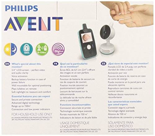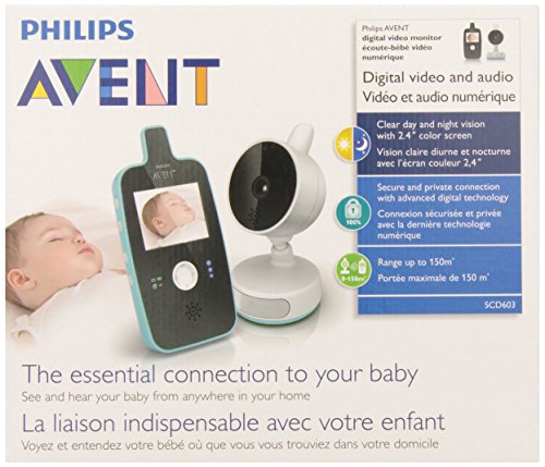 See and hear your baby from anywhere in the home. The Philips AVENT SCD603/10 baby monitor enables you to maintain a secure connection with your baby at all times. As well as perfect sound quality, you can now also see your baby, day or night, with a high resolution 2.4" color screen, and an automatic infra red night vision. You can also soothe your baby by remotely selecting lullabies and by using the soft baby nightlight. With a 100% private connection, and a range up to 150 meters, this monitor is fully portable and easy to use, and can be voice activated where the screen and volume switch on if your baby starts crying. There is a rechargeable parent unit, and a wall mountable baby unit. Led lights show you when the unit is linked and in range, and there is a backup battery function in case of power failure. A belt clip provides hands free convenience and mobility.Feature