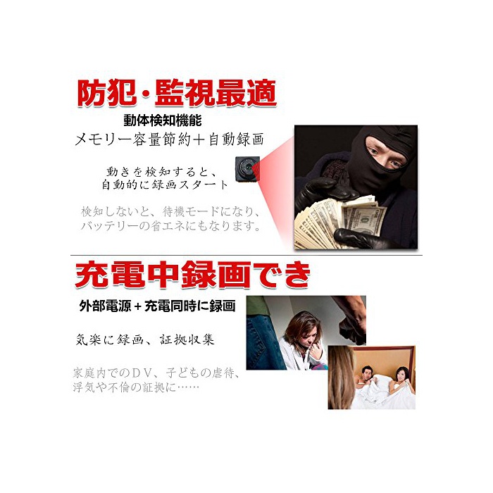 동신체검사 지모드에서는,움직임을 검지해 녹화 개시.빈집털이나 스토커,가정내 에서의 학대나 DV등의 증거를 기록하는 것 를 할 수 있습니다.