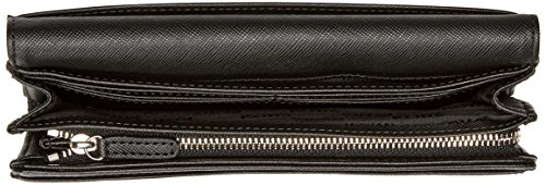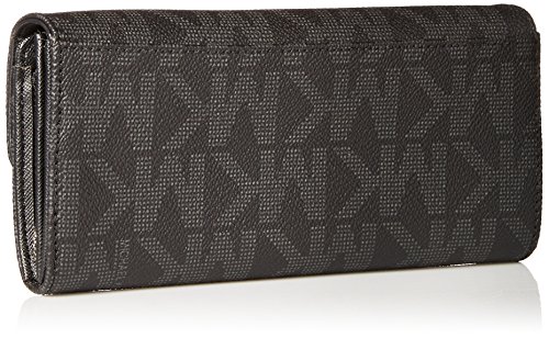 Stylish and convenient for all your wallet necessities, Michael Kors Jet Set Slim Flap Wallet in black PVC Signature mongram pindot print will co-ordinate with any black or charcoal grey bag! The exterior features a snap front closure, silver signature nameplate and a backside slip pocket. The interior features 2 slip pockets, 1 zip top long coin compartment, 2 bill/currency compartments, 6 card slots and black signature jacquard fabric lining. Measures approximately 7.75" W x 3.5" H x 1.5" D ImportedFeature