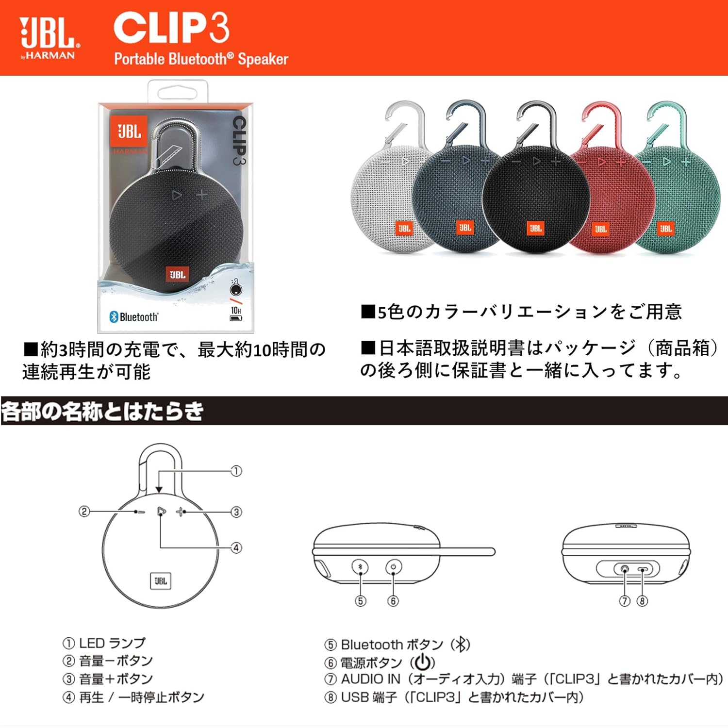 持ち運び可能な コンパクト設計ながら、JBL の高音質を実現 Bluetooth搭載で、最大約10時間の連続ワイヤレス再生を実現 もしもの水没にも対応した防水性能(IPX7)搭載 ビルトインカラビナでどこでもセッティング可能 ハンズフリー通話にも対応 豊富なカラーバリエーション