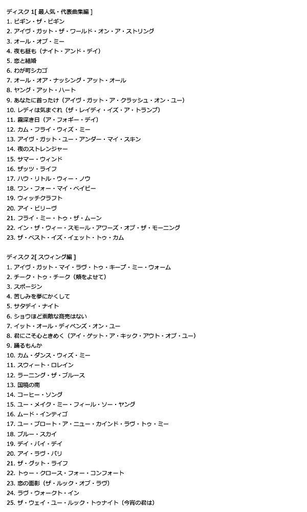 46年のソロデビューから全盛期を経て、円熟期を迎えた60年代半ばまでの録音から、本当に良い曲だけをバランス良く選曲・構成した充実度抜群のベスト盤。大ヒット曲や隠れた名曲、素晴らしいスウィングやバラードも満載の永久保存盤です! |