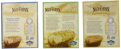 -. Binding : Misc. -. Brand : Blue Diamond Almonds -. EAN : 0787637474410 -. Feature : Certified Gluten Free / Made with real almonds / 130 Calories for 16 crackers / 3 Grams of Protein per serving / This item is not a manufacturer-created variety pack and will not be sent in the original manufacturer's packaging -. IsAdultProduct : 0 -. Label : Blue Diamond Natural -. Manufacturer : Blue Diamond Natural -. PackageQuantity : 3 -. ProductGroup : Grocery -. ProductTypeName : GROCERY -. Publisher : Blue Diamond Natural -. Studio : Blue Diamond Natural -. Title : Blue Diamond Wheat & Gluten Free Nut & Rice Crackers 3 Flavor Variety Bundle: (1) Blue Diamond Original Almond Nut-Thins Cracker Snacks, (1) Blue Diamond Country Ranch Almond Nut-Thins Cracker Snacks, and (1) Blue Diamond Pepper Jack Cheese Almond Nut-Thins Cracker Snacks, 4.25 Oz. Ea. (3 Boxes Total) -. UPC : 787637474410