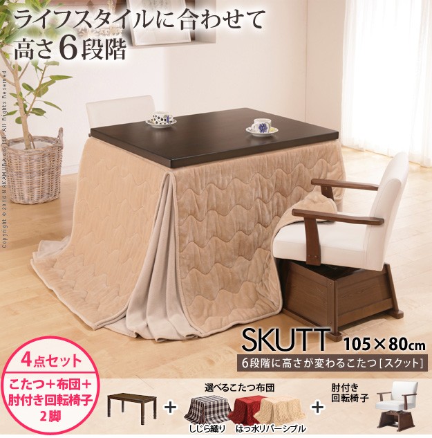 ※メーカー直送のため代金引換はお受けできません。※沖縄・一部離島は別途送料がかかります。お見積もりいたしますのでお問い合わせ下さい。セット内容:こたつx1台、こたつ布団x1枚、肘付回転椅子x2脚薄型石英管ヒーター(600W・中間スイッチ式)、コード長3mサイズ(cm):こたつ-幅105x奥行80x高さ70(45/50/55/60/65)・約27kg、椅子-幅57x奥行54x高さ72(67)・約10.5kg、布団-265x240cm椅子カラー:ホワイト布団バリエーション:しじら織り・レンガxブラウン・ベージュxグレー材質:こたつ天板-天然木化粧繊維板(楢)、こたつ幕板・脚部-天然木(ラバーウッド)、椅子本体-天然木(ラバーウッド)、布団表地-しじら/綿100%、レンガ・ベージュ/ポリエステル100%(撥水フランネル)一部組立品(脚部取付)株式会社ナカムラ(I-3302103)