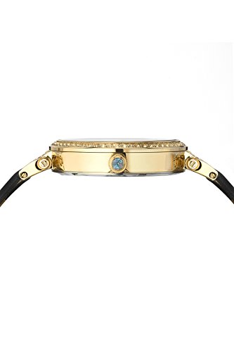 39 mm case diameter; 8 mm case thickness; Black satin covered genuine leather strap; Gold tone stainless steel case; Deployment buckle on the band is adjustable