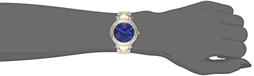 Blue dial with gold tone hands and roman numerals; gold tone ion-plated stainless steel bezel encrusted with white crystals; gold tone ion-plated stainless steel crown; sapphitek crystal; stainless steel case encrusted with white crystals on lugs; stainless steel bracelet with gold tone ion-plated stainless steel center links