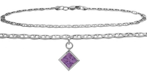 -. Title : 14K White Gold Mariner Anklet with Genuine Amethyst Square Charm