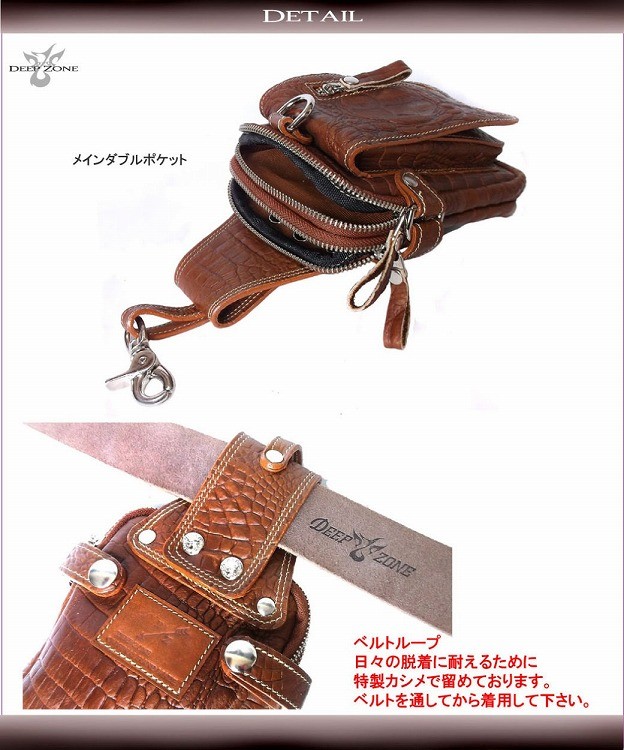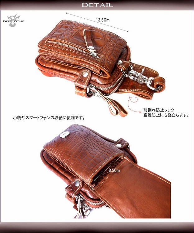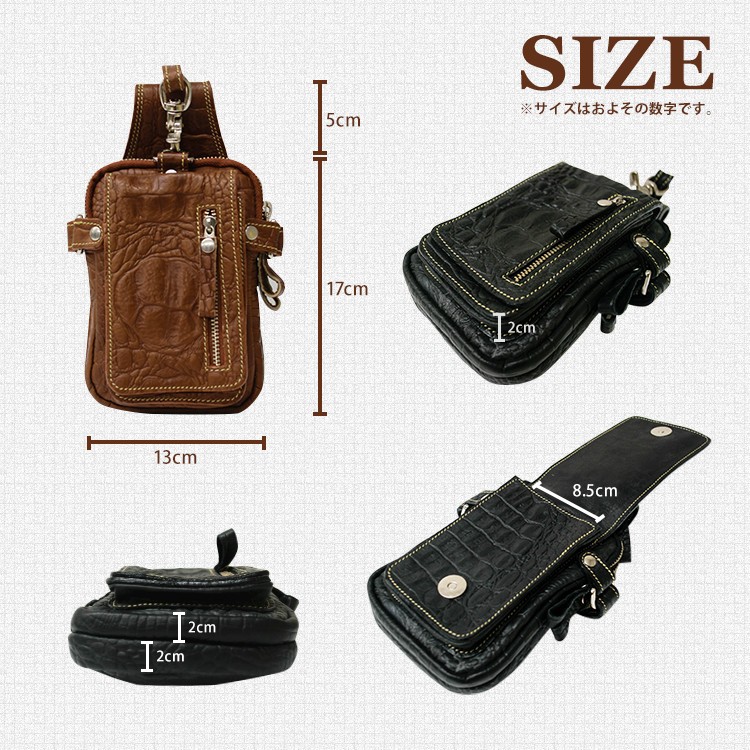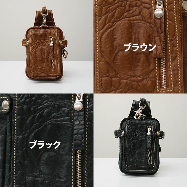 一流革職人がハンドメイドで仕上げられた、本革 レザーヒップバッグ ウエストバッグ。上質の牛革をクロコダイルの背革の模様に細部まで型押しされています。使用するパーツにまでこだわり普段持ち歩く財布、スマートフォン、車のキーや手帳等の小物を収納してスタイリッシュに持ち運びできます。【素材】牛革  【サイズ】高さ22cm × 幅13cm × マチ6cm(2cm・2cm・2cm)【カラー】ブラウン・ブラック