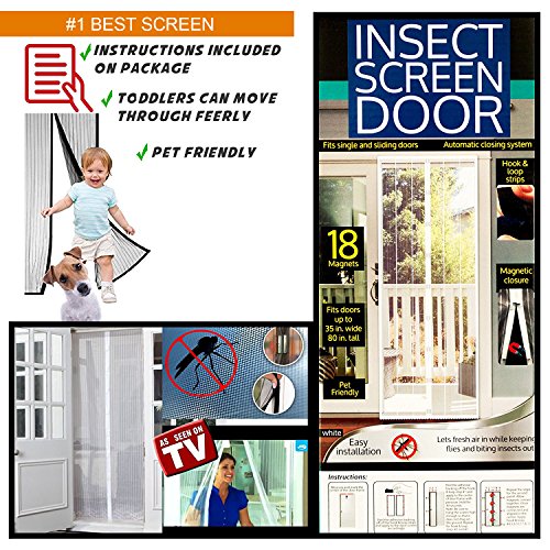 Studio : TinyPrice Publisher : TinyPrice Binding : Misc. Product Description Let fresh air in while keeping flies and biting insects out with this Insect Bug Screen Door featuring a white fine mesh screen with a magnetic closure and hook loop strips. Magic Magnetic closure with 18 magnets creates an automatic closing system. Fits single and sliding doors up to 82" tall x 35" wide. Pet friendly. Easy installation. Instructions included on package. Comes packaged in an individual box. 0