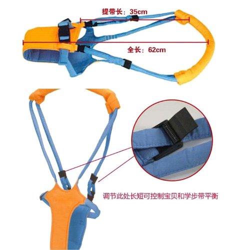 -. Feature : Baby walking assistant / Material :100% breathable material, with soft sponge / Fitable years:6 monthes-2 years old / Size: basket to adjust 52 cm - 62 cm high, can adjust at length, the waist size can adjust, handle solid / Washing:warm water 20 °, hand washing, don't put in the washing machine .