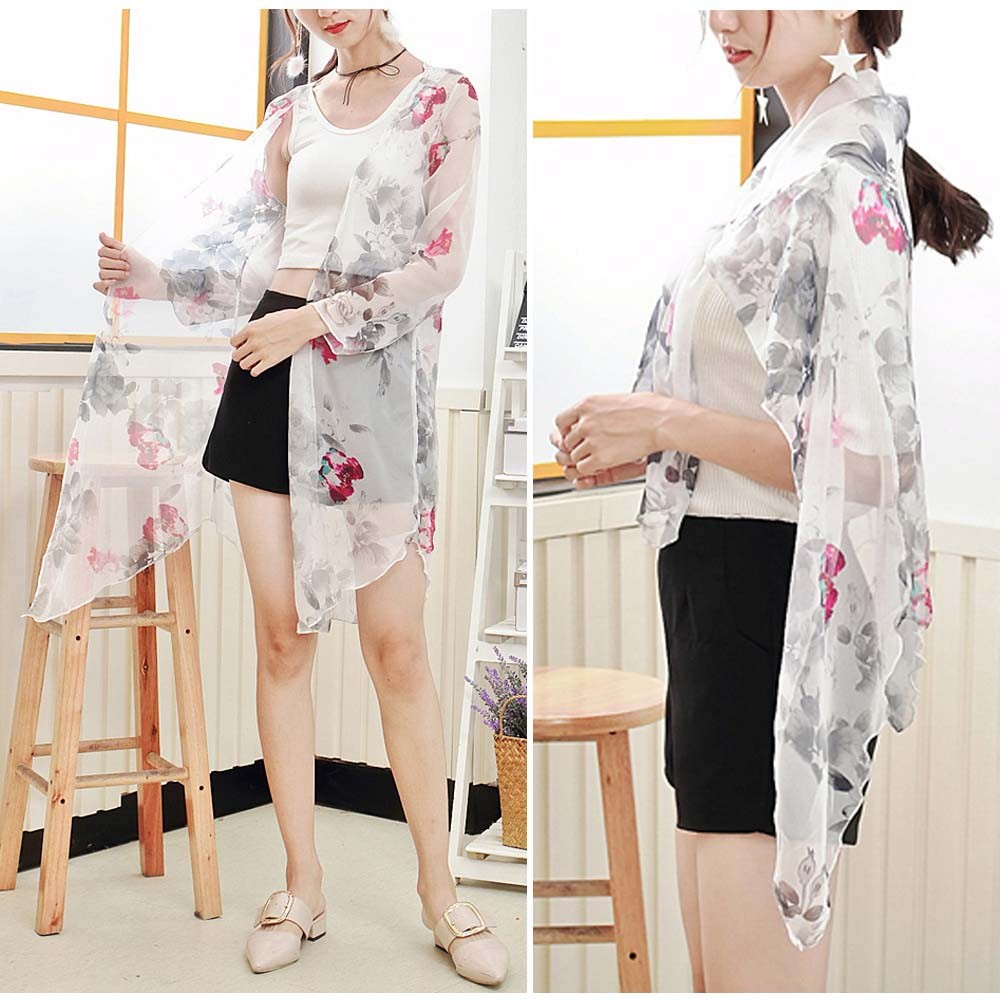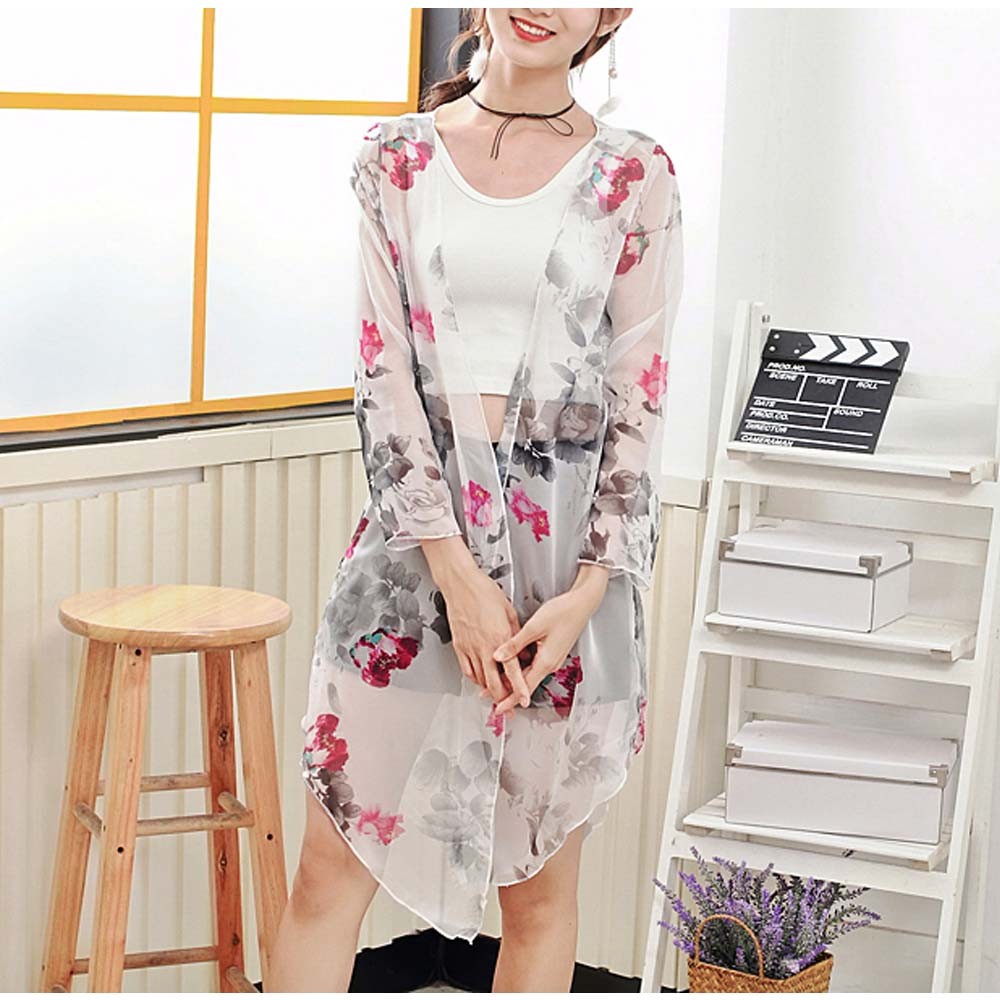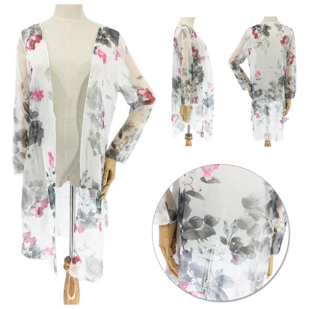 大ぶり花柄プリントが可愛いロング丈シースルーシフォンカーディガン