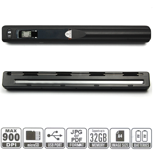 This is a truly portable handheld scanner, ideal for use when visiting clients, customers etc when a power supply is unavailable or inconvenient.The portable USB scanner is moved over the area and its sensitive colour image sensor scans at high (900dpi) or standard (300dpi) resolution, and then saves the captured images as JPEG files on the microSD card.