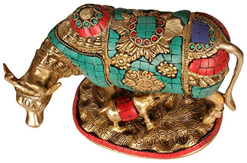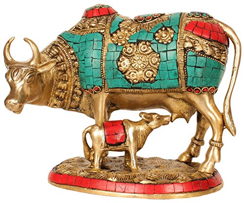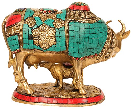 9" Beautiful Lucky Nandi Kamdhenu COW & Calf Sculpture Brass Statue Idol Religious - Home Decor Mother Baby Shower Gift ...
