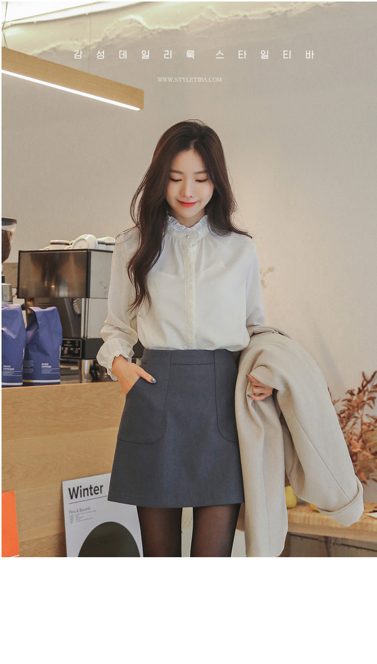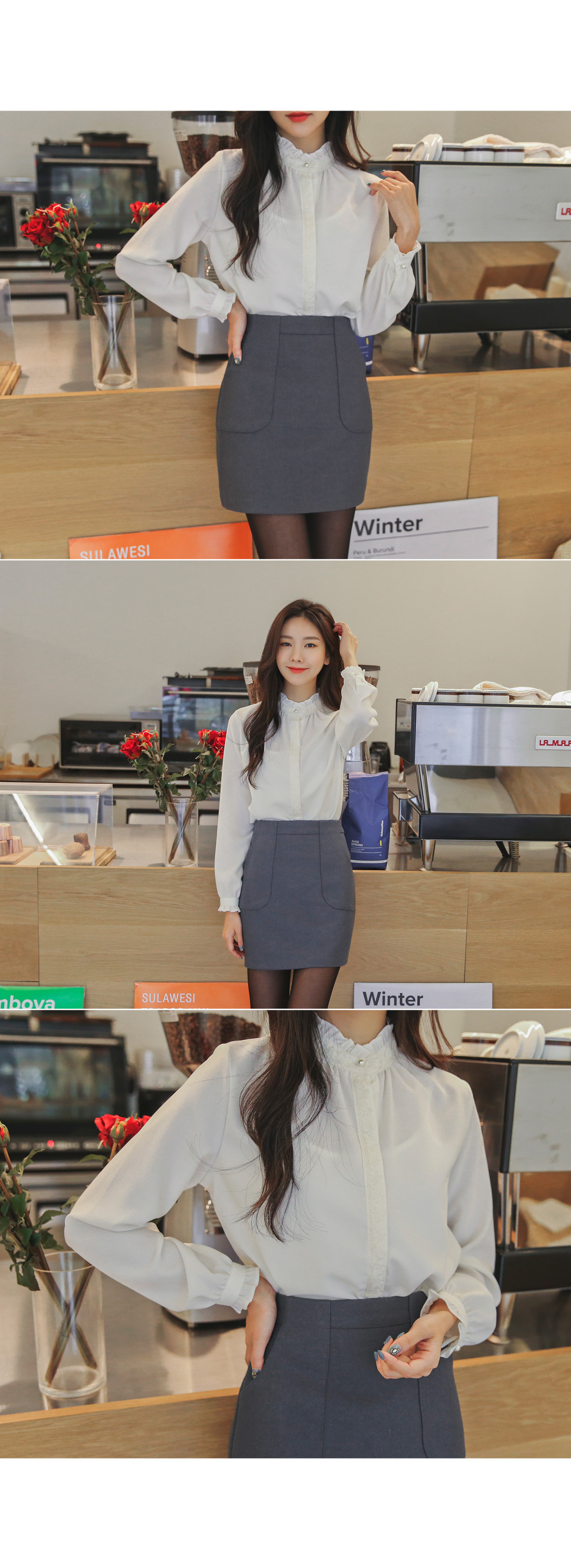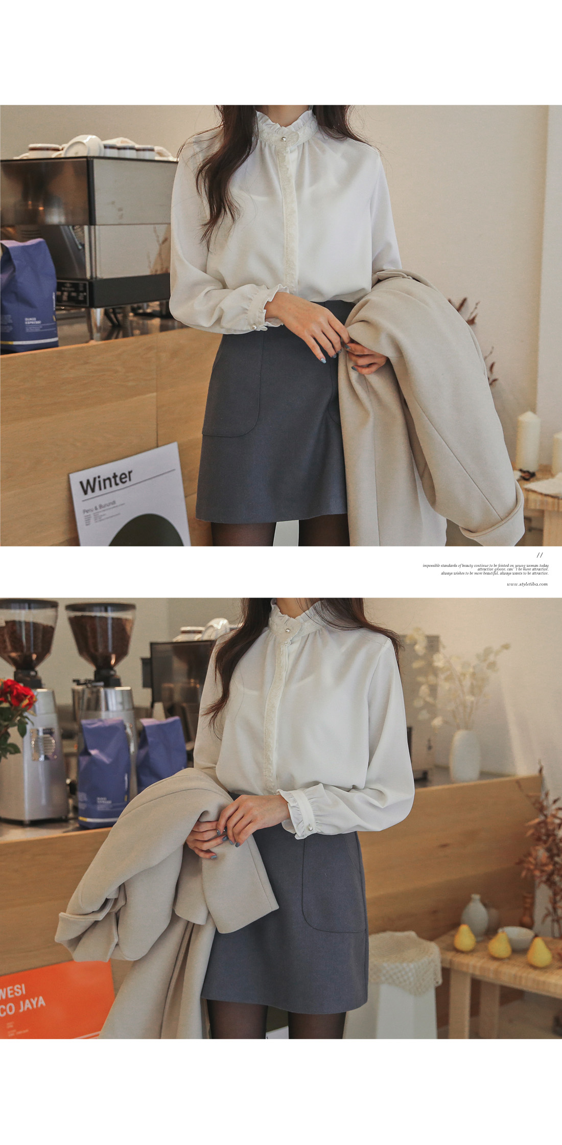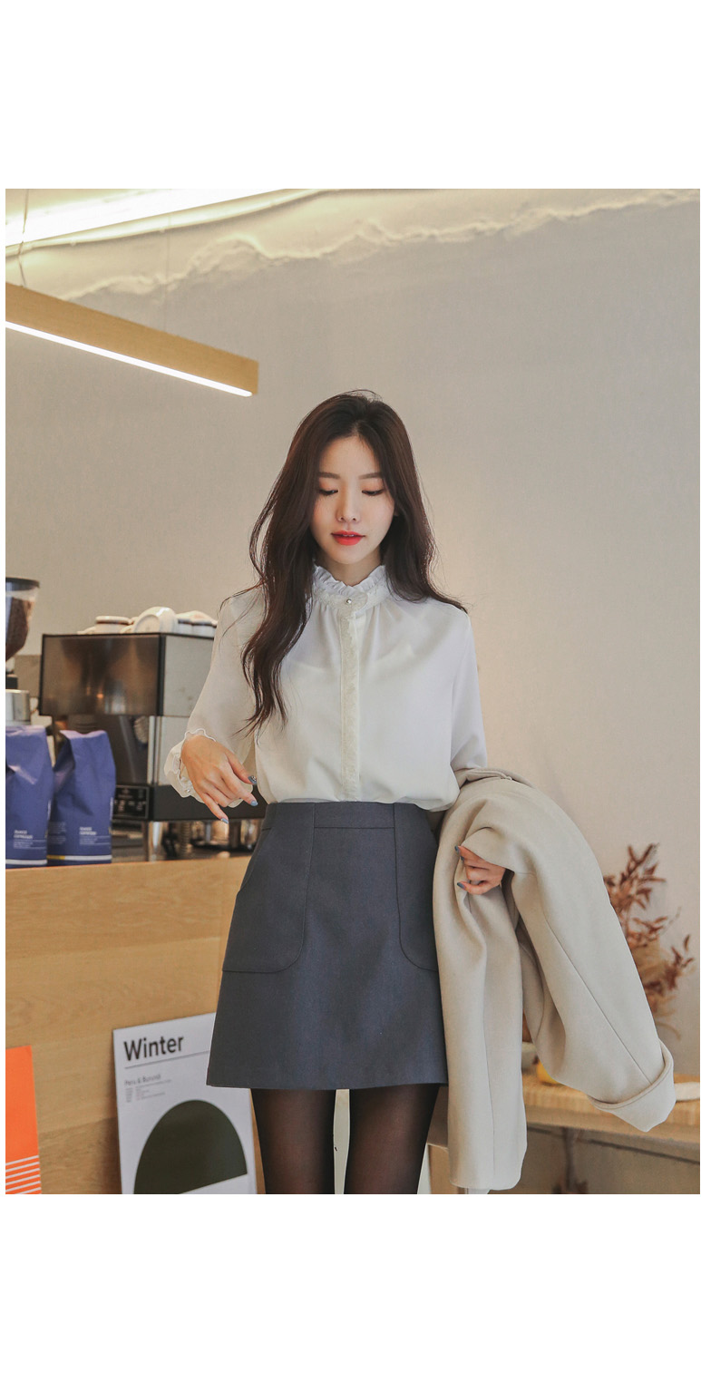 깔끔하고 단정한 느낌의 차이나 카라에 레이스 라인을 더하고