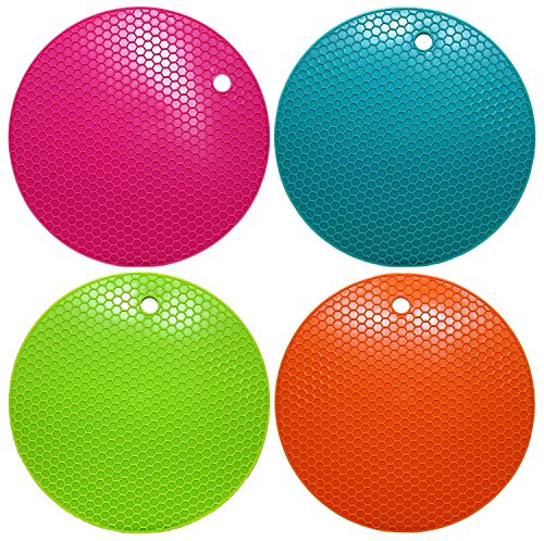 Set of Silicone Pot Holders! Non-slip, Jar Opener, Spoon Rest, Garlic Peeler, Insulated, Durable, Flexible, Heat Resistant Hot Pads! 4 Assorted Colors! Dishwasher Safe! (Set of 4 Round)