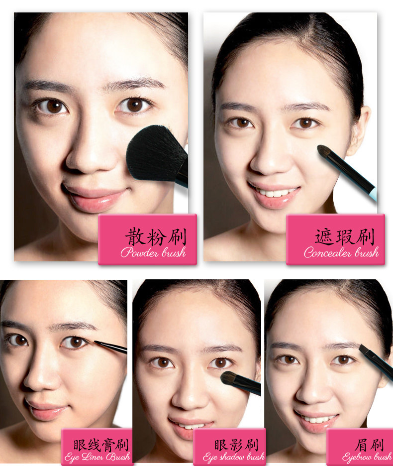 从左到右依次: 蜜粉/散粉/腮红刷:刷长14.3cm 进口纤维毛,刷毛柔软舒适,毛量丰富,适用于快速上妆,蘸上蜜粉,刷在涂有粉底的脸上,能把粉刷的非常均匀,使色彩更加柔和协调。