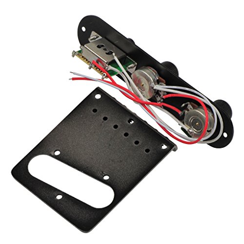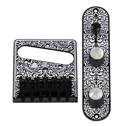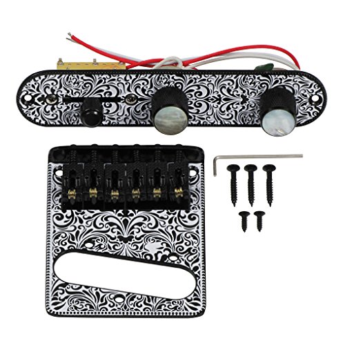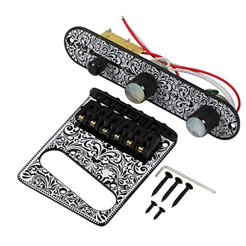 Studio : iknmusic Publisher : iknmusic Product Description Features: Pre-wired guitar control plate with bridge set for Fender Tele Style Guitar. The control plate includes 3-way switch, A500K B500K pots and two metal knobs. The metal guitar bridge is with 6 string saddles, adjustable for intonation and height. The bridge plate and control plate are made of zinc alloy material, with decorative patterns. Color: Black/White with decorative patterns. With mounting screws and wrench.