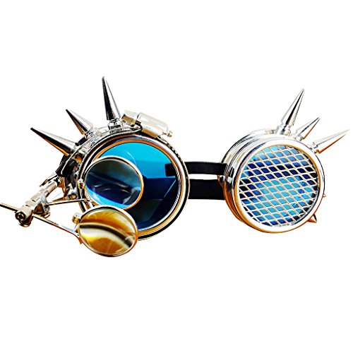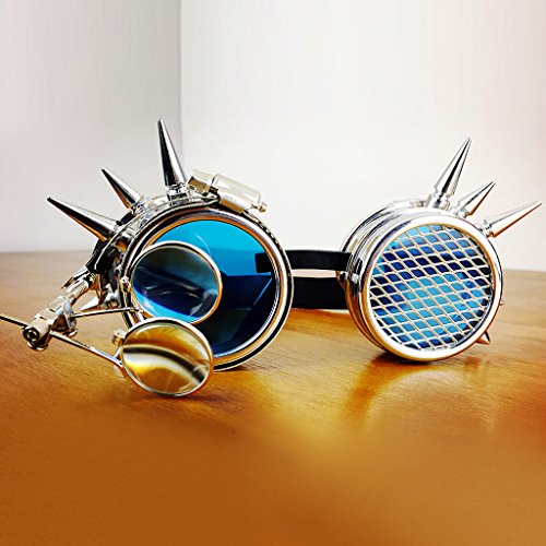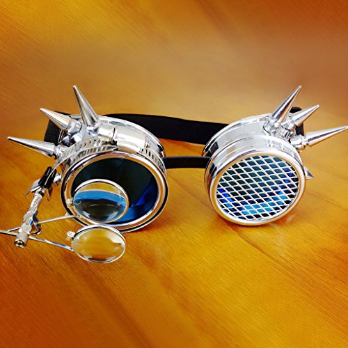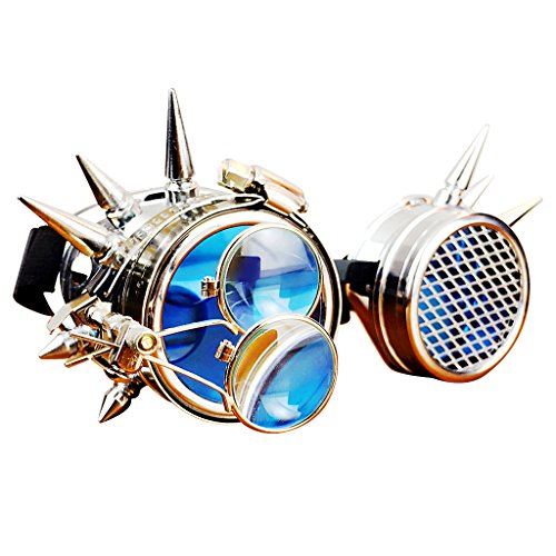 Description: - Fits different head size with adjustable elastic band; - Elastic headband helps the goggles stay in place for lasting protection; - Tough blue lens provides impact resistance with magnifying loupes;(magnifying just for decorative,Not Really magnifying glass) - Application: Cosplay,photo prop,outdoor sports etc. - A necessary accessory for steampunk's wardrobe;