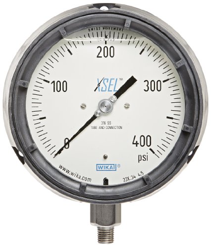 WIKA 9833875 Process Pressure Gauge, Liquid-Filled, Stainless Steel 316L Wetted Parts, 4-1/2" Dial, 0-400 psi Range, +/- 0.5% Accuracy, 1/4" Male NPT Connection, Bottom Mount