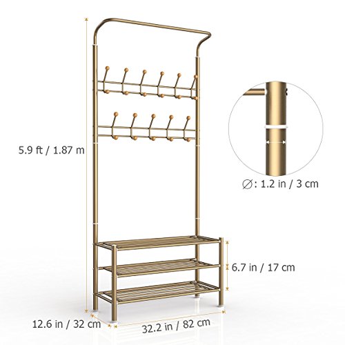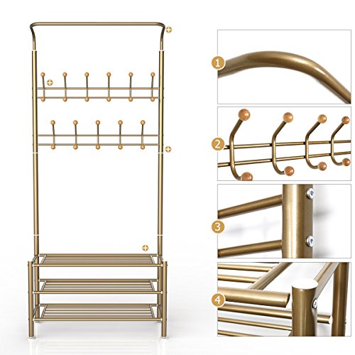 -. Title : HOMEMAXS Entryway Coat Rack with Storage 3-Tier Shoes Rack, Hat Rack Clothes Garment Rack Including 22 Hooks (Champagne) 33 x 71 x 12 Inch