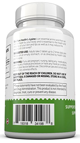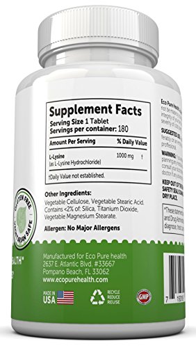-. Feature : L-Lysine is a vital amino acid which can support the immune system, Respiratory Health and Support healthy connective tissues. / Anti-Viral Action - An essential amino acid that cannot be made in your body, and is essential to the health and integrity of the skin and lips, and may reduce the severity of cold sores. / Be the healthier you! L-lysine is used by the body to product collagen / Eco Pure Health L-Lysine Helps to maintain the immune system and energy levels. / Worry Free Digestion: Manufactured in the USA at an FDA Registered Facility. GMP Certified. No-GMO ingredients. Gluten Free and Suitable for Vegetarians and Vegans