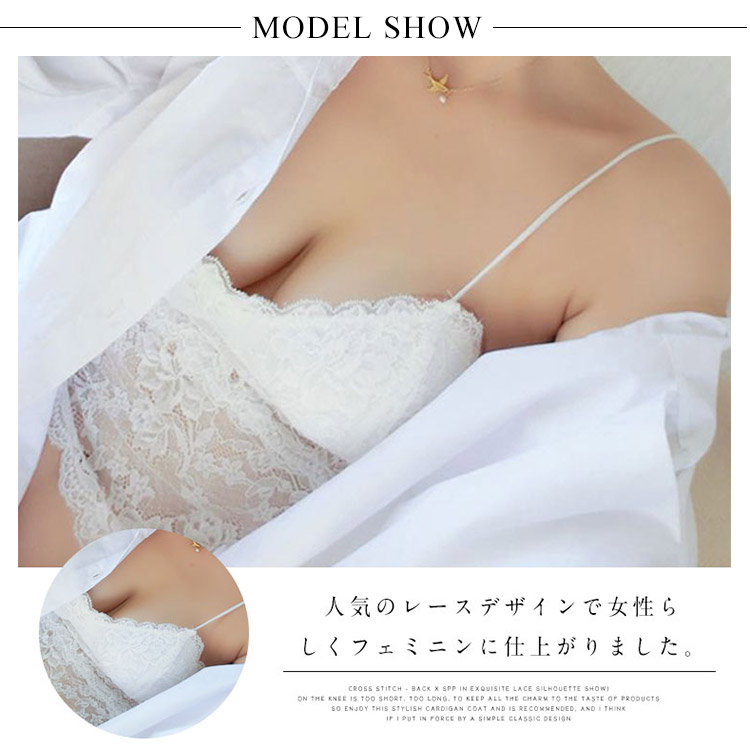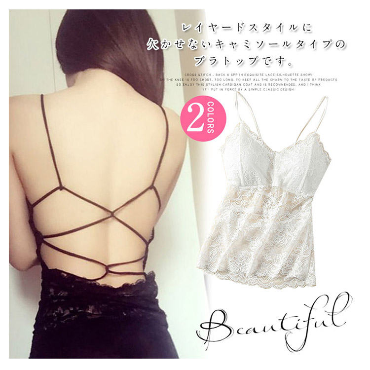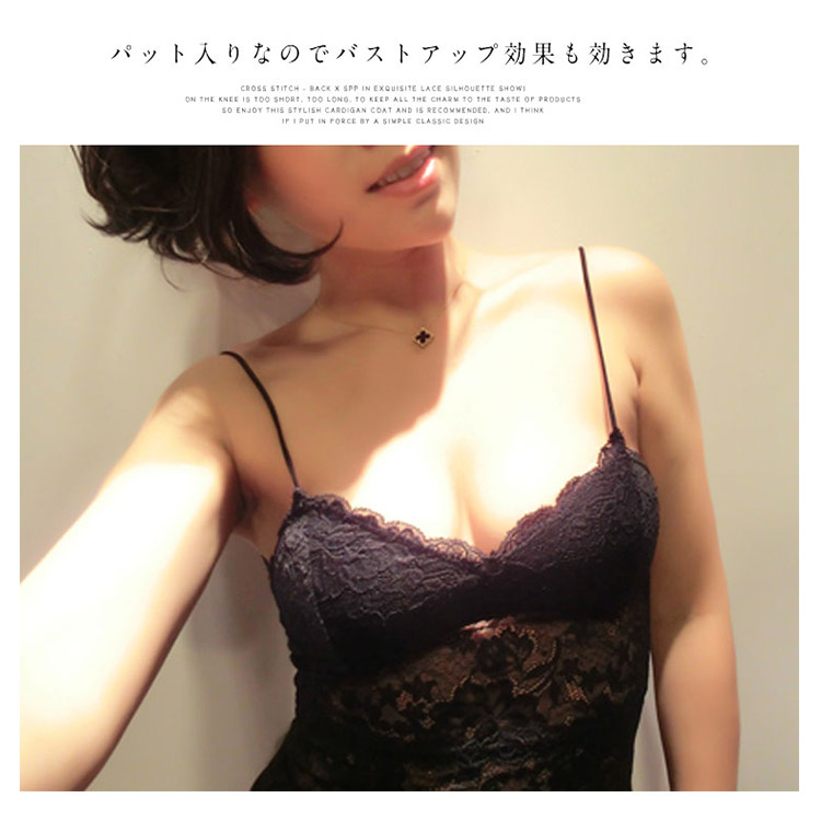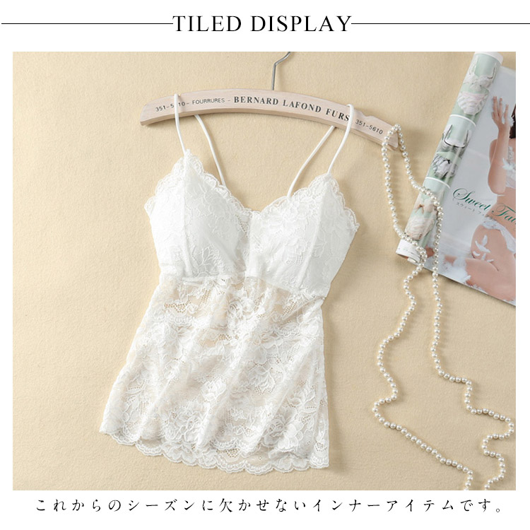 | レイヤードスタイルに欠かせないキャミソールタイプのブラトップです。人気のレースデザインで女性らしくフェミニンに仕上がりました。パット入りなのでバストアップ効果も効きます。ストレッチがありますので着脱も楽ちんです。これからのシーズンに欠かせないインナーアイテムです。 | |