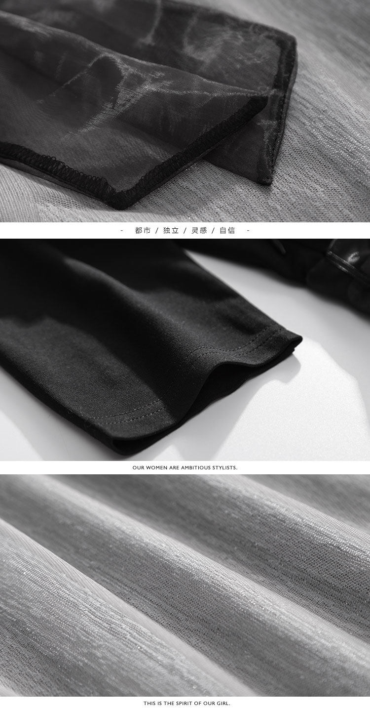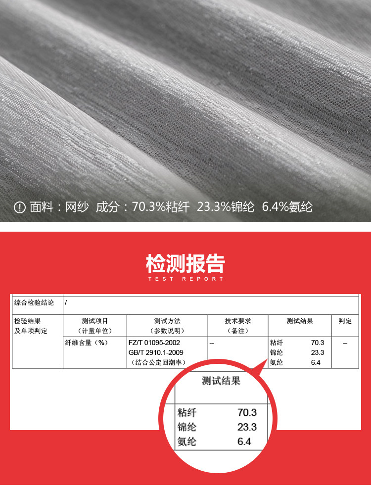 | 面 料:主布:70.3%粘纤 23.3%锦纶 6.4%氨纶 撞布1:锦纶 撞布2:聚酯纤维 里 料:聚酯纤维颜 色:黑色 |