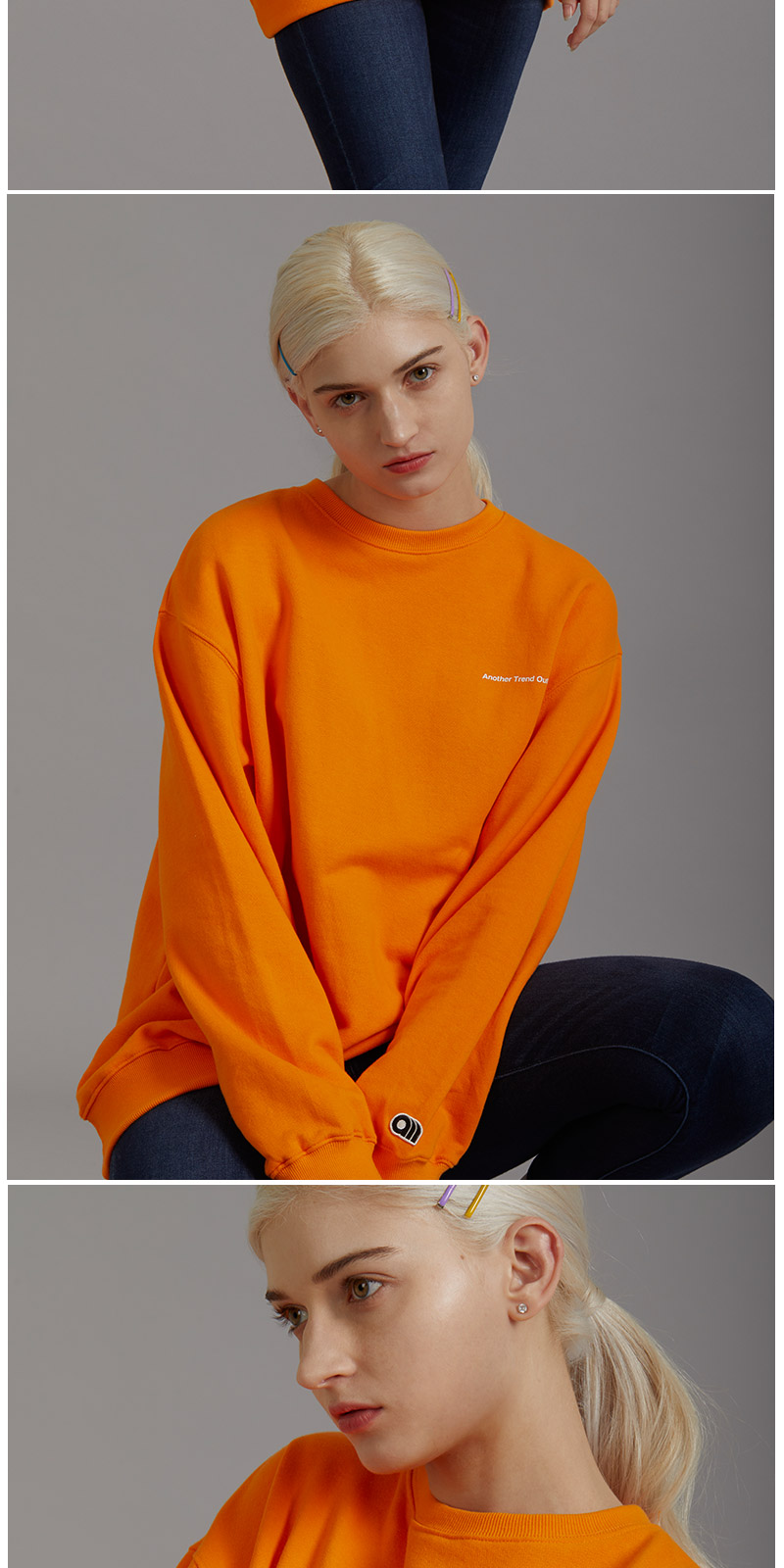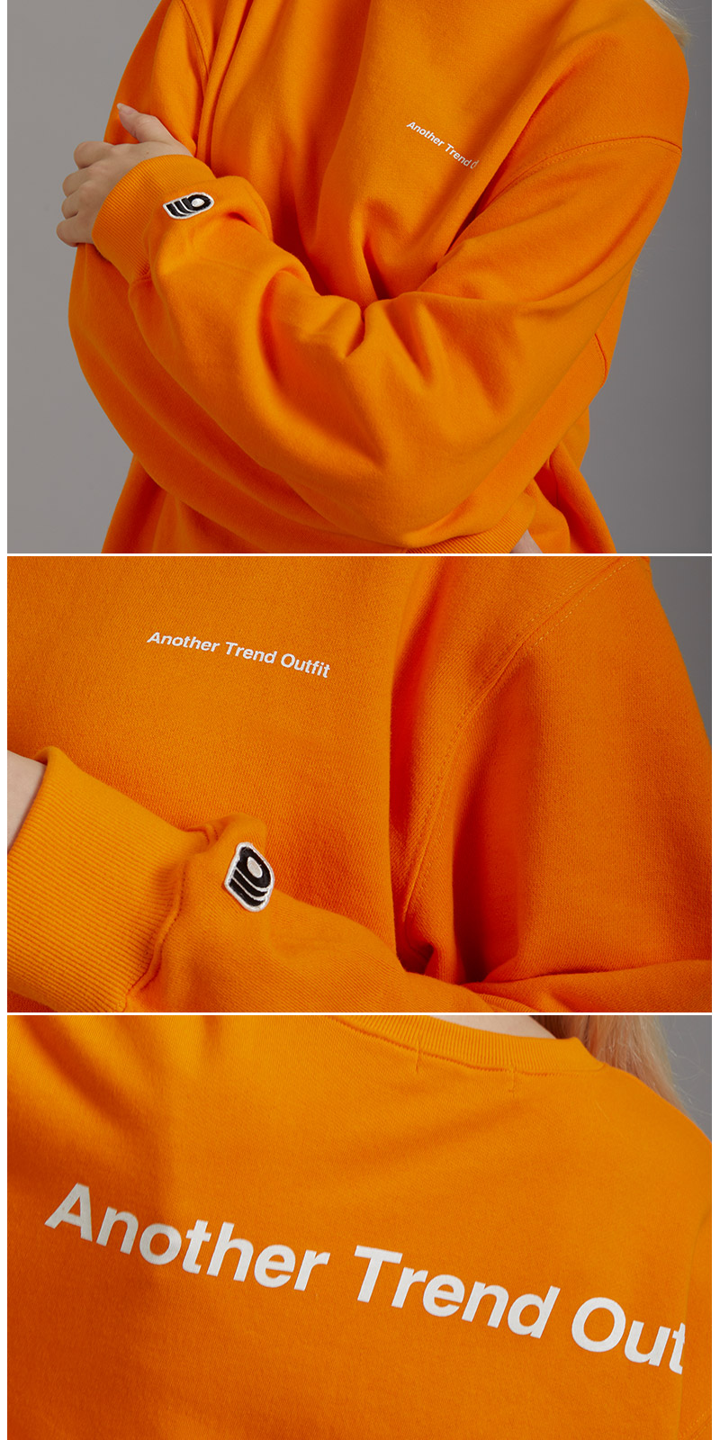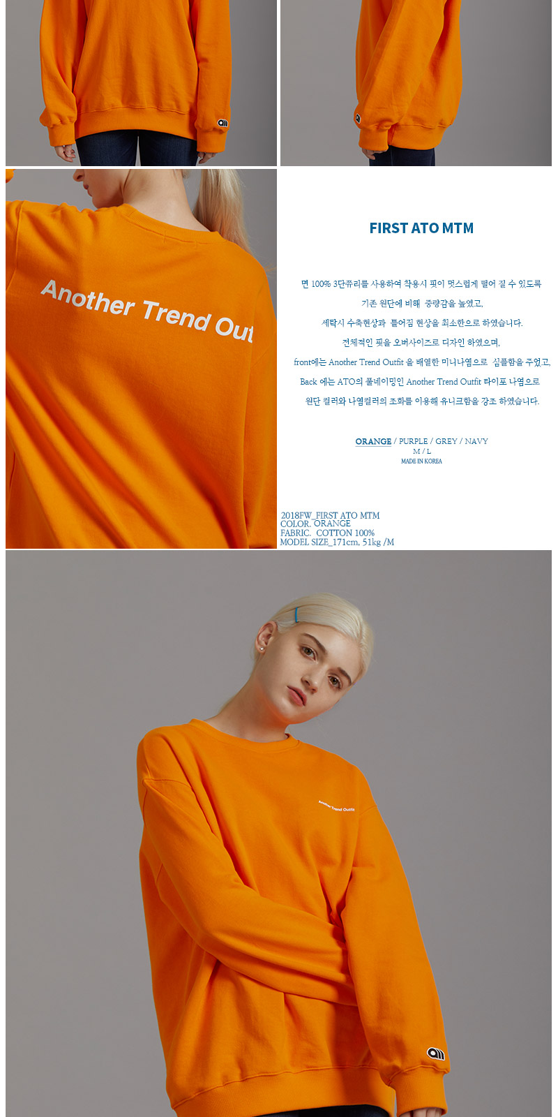 | 면 100% 3단쮸리를 사용하여 착용시 핏이 멋스럽게 떨어 질 수 있도록 기존 원단에 비해 중량감을 높였고, 세탁시 수축현상과 틀어짐 현상을 최소한으로 하였습니다. 전체적인 핏을 오버사이즈로 디자인 하였으며, front에는 Another Trend Outfit 을 배열한 미니나염으로 심플함을 주었고, Back 에는 ATO의 풀네이밍인 Another Trend Outfit 타이포 나염으로 원단 컬러와 나염컬러의 조화를 이용해 유니크함을 강조 하였습니다. |
