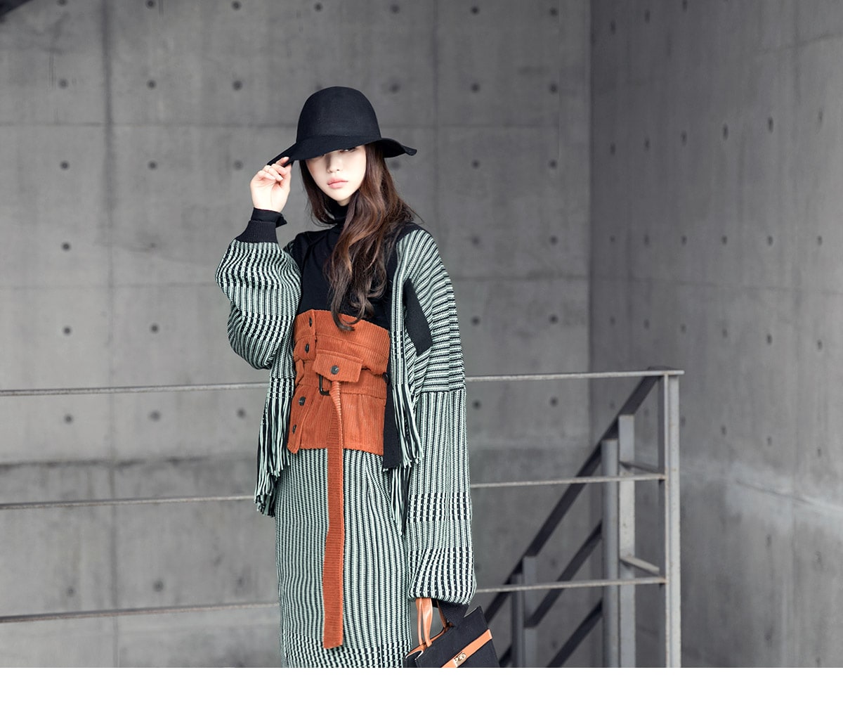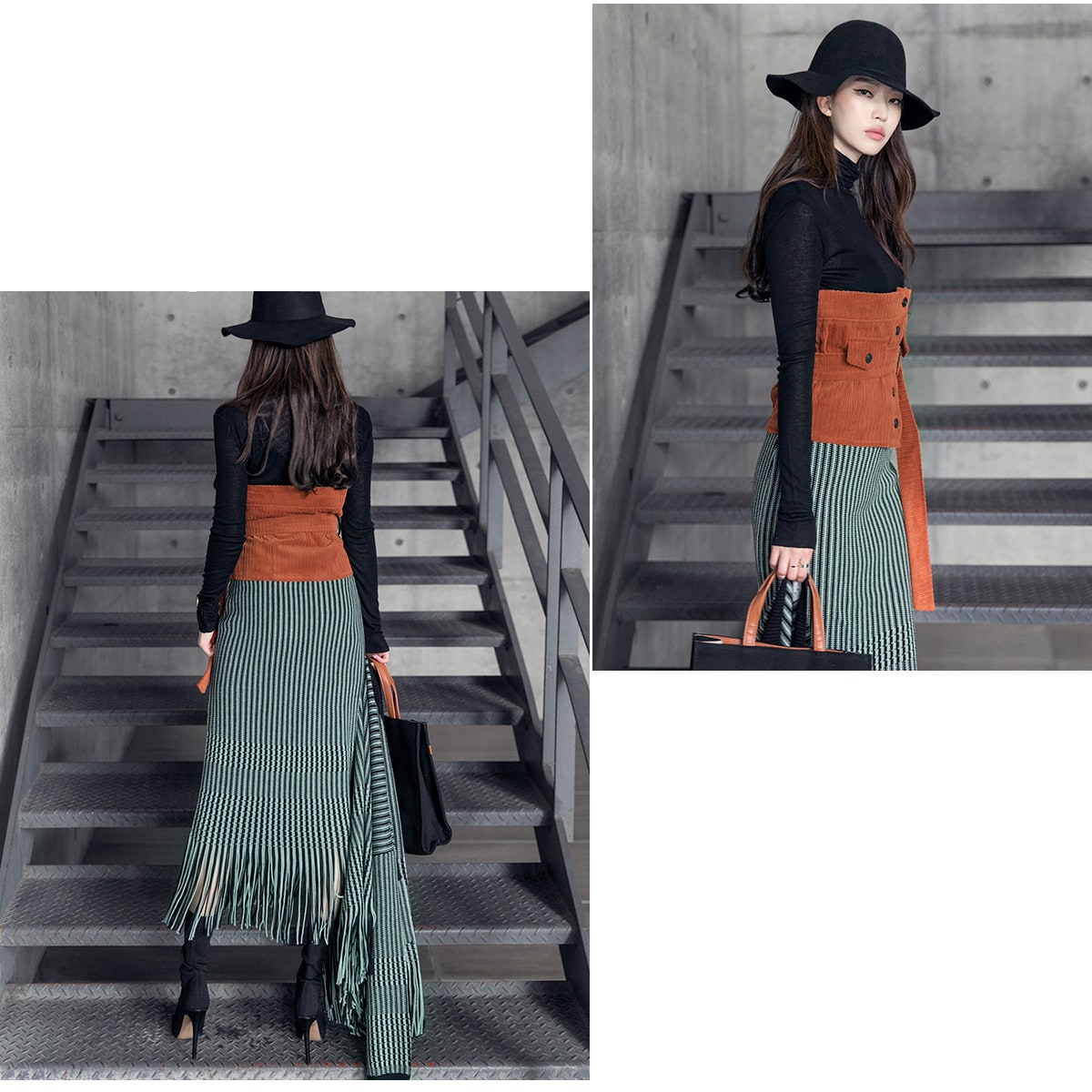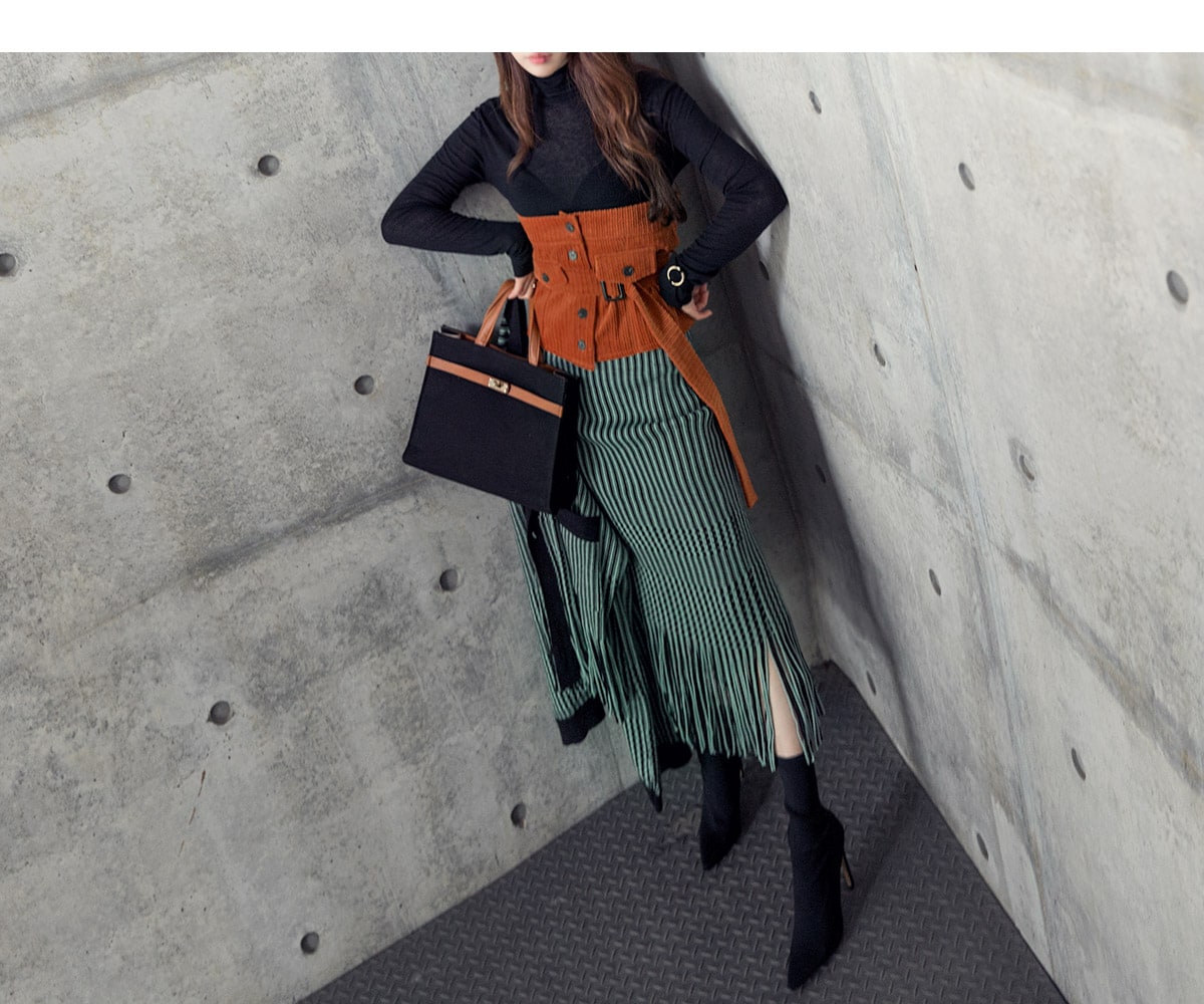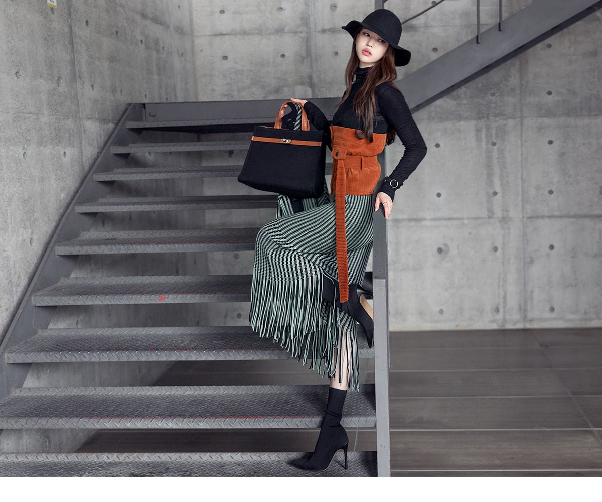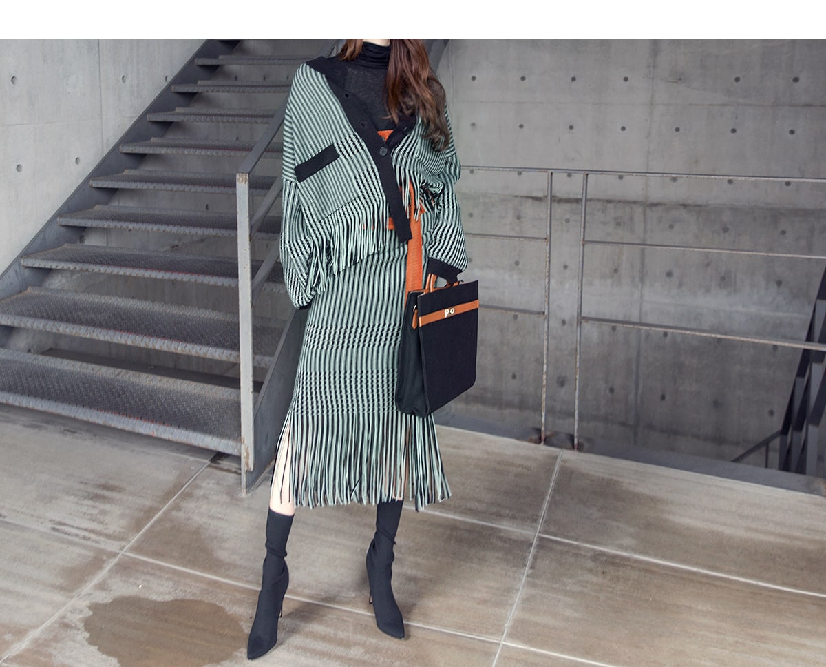 <모델 코디 제품명> SK1772 유니크 수술 컬러 니트 스커트 Mint mix E1795 베이스 라인 폴라 탑 Black E1797 컬러칩 골지 뷔스티에 탑(벨트set) Orange AC-481 모더니즘 울 페도라 햇 Black AJ-3908 링(6개set) Gold A-954 금장 배색 모던 토드백 Black AR-2163 베이스 레그 삭스 힐 Black * 모델이 착용한 뱅글은 스타일리스트 개인소장품입니다