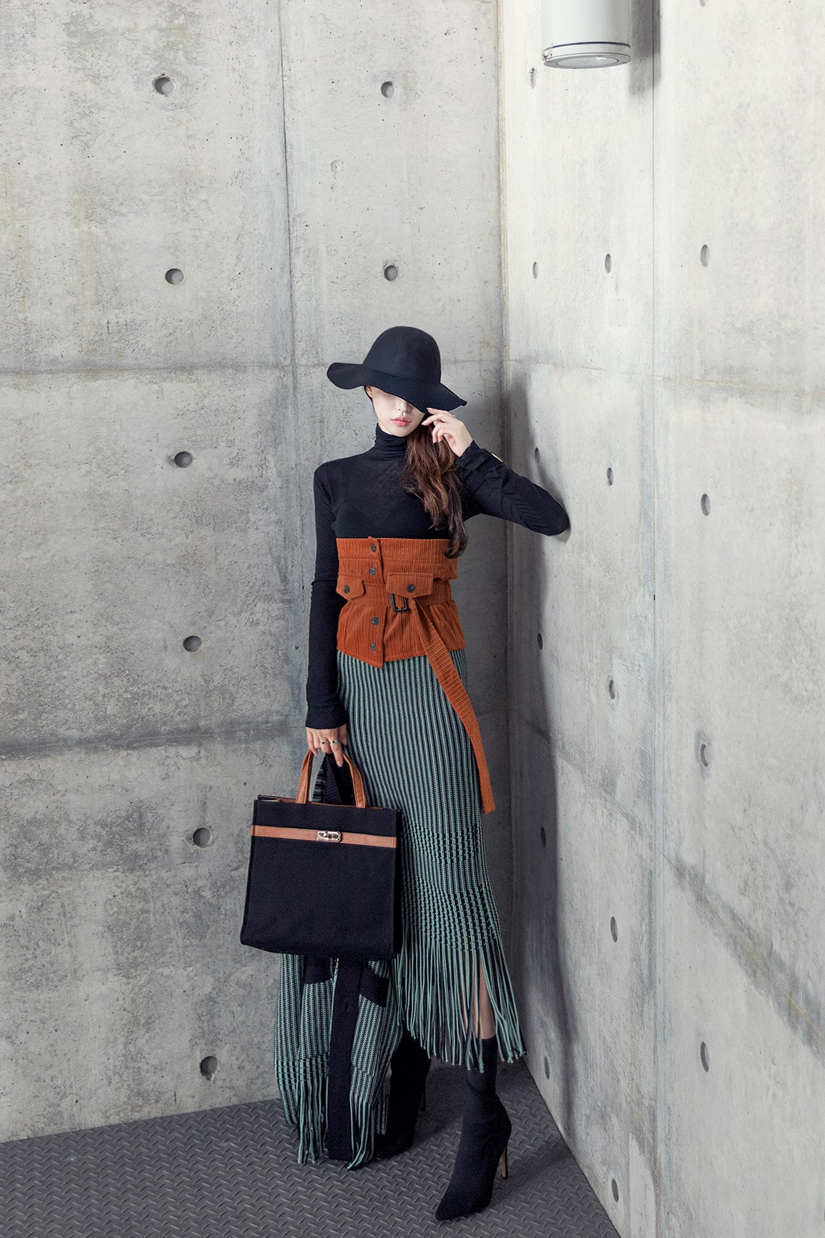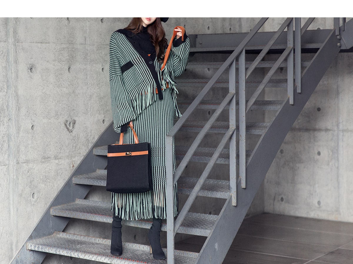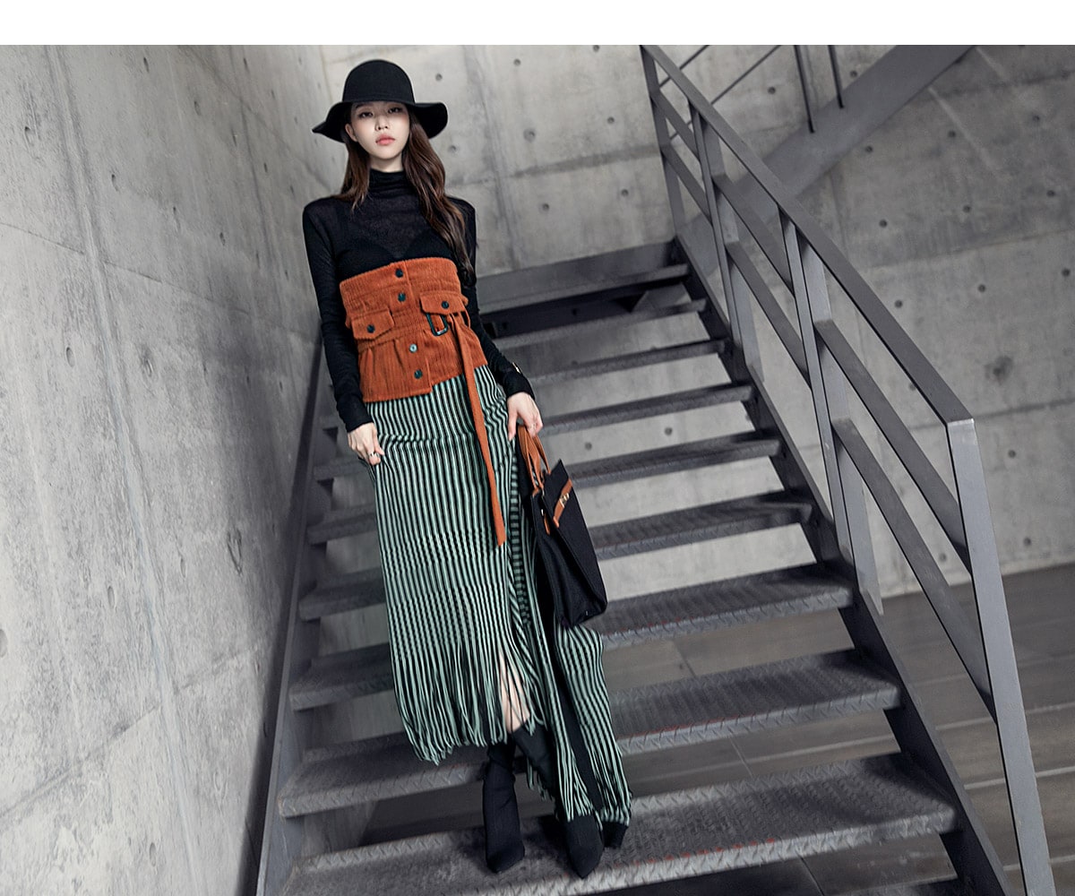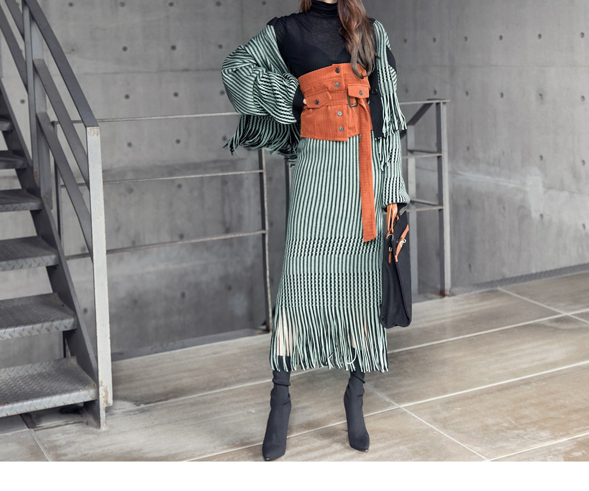 <모델 코디 제품명> SK1772 유니크 수술 컬러 니트 스커트 Mint mix E1795 베이스 라인 폴라 탑 Black E1797 컬러칩 골지 뷔스티에 탑(벨트set) Orange AC-481 모더니즘 울 페도라 햇 Black AJ-3908 링(6개set) Gold A-954 금장 배색 모던 토드백 Black AR-2163 베이스 레그 삭스 힐 Black * 모델이 착용한 뱅글은 스타일리스트 개인소장품입니다