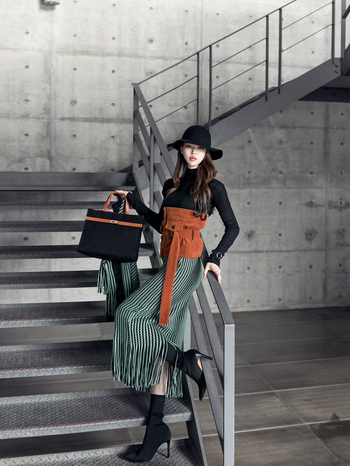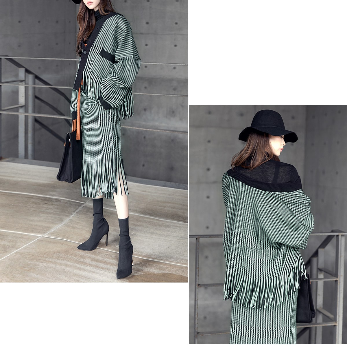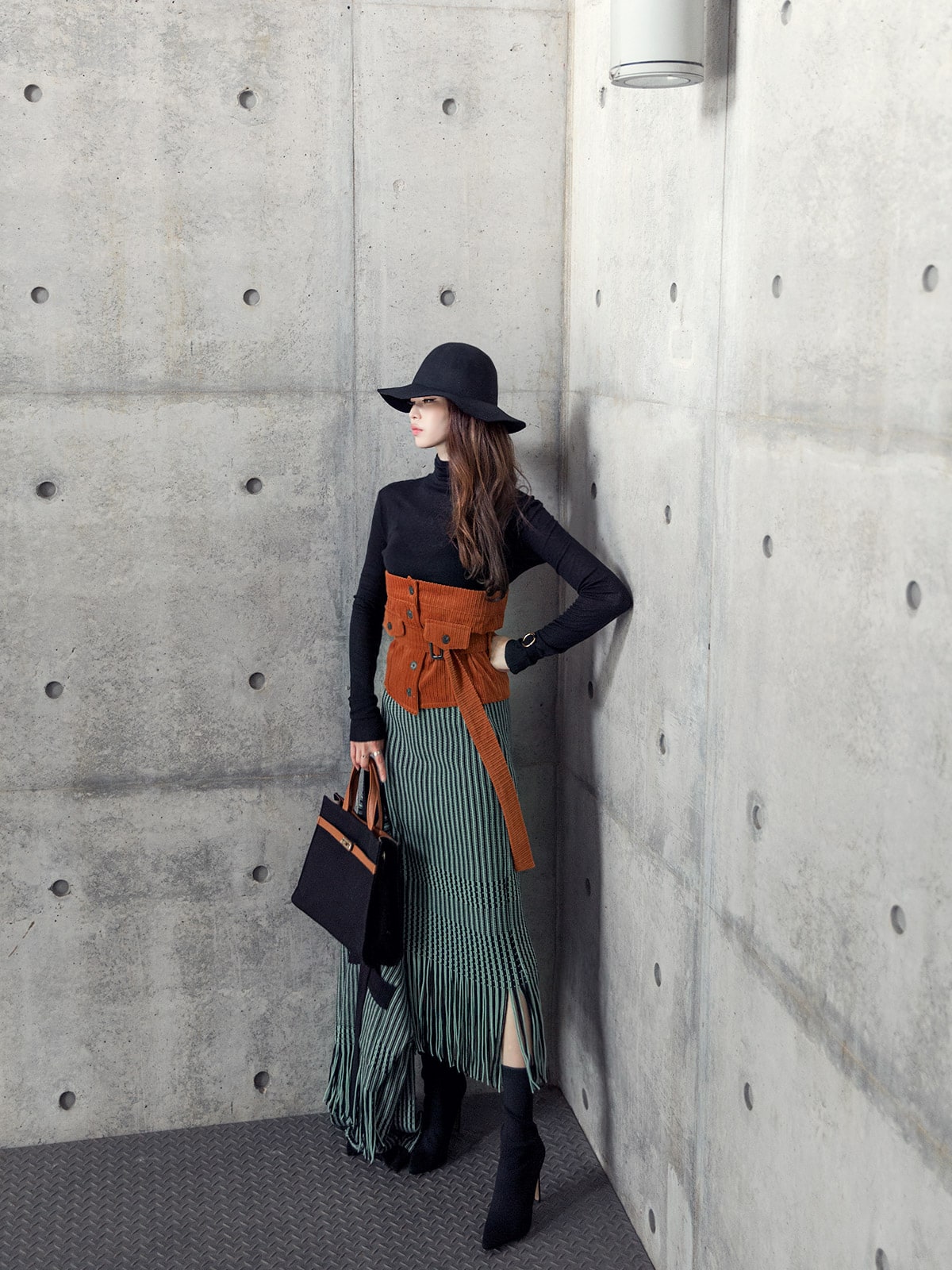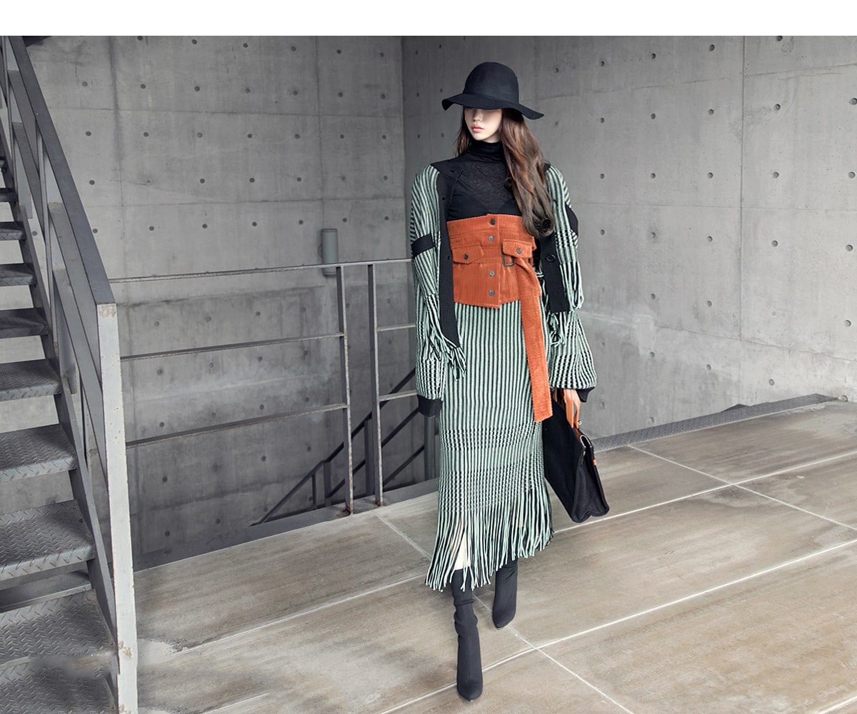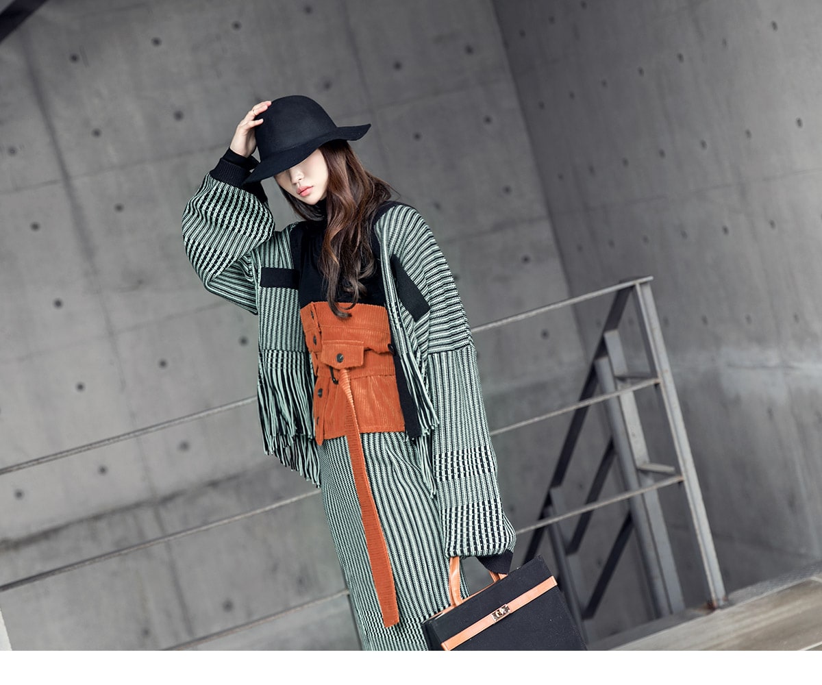 <모델 코디 제품명> SK1772 유니크 수술 컬러 니트 스커트 Mint mix E1795 베이스 라인 폴라 탑 Black E1797 컬러칩 골지 뷔스티에 탑(벨트set) Orange AC-481 모더니즘 울 페도라 햇 Black AJ-3908 링(6개set) Gold A-954 금장 배색 모던 토드백 Black AR-2163 베이스 레그 삭스 힐 Black * 모델이 착용한 뱅글은 스타일리스트 개인소장품입니다