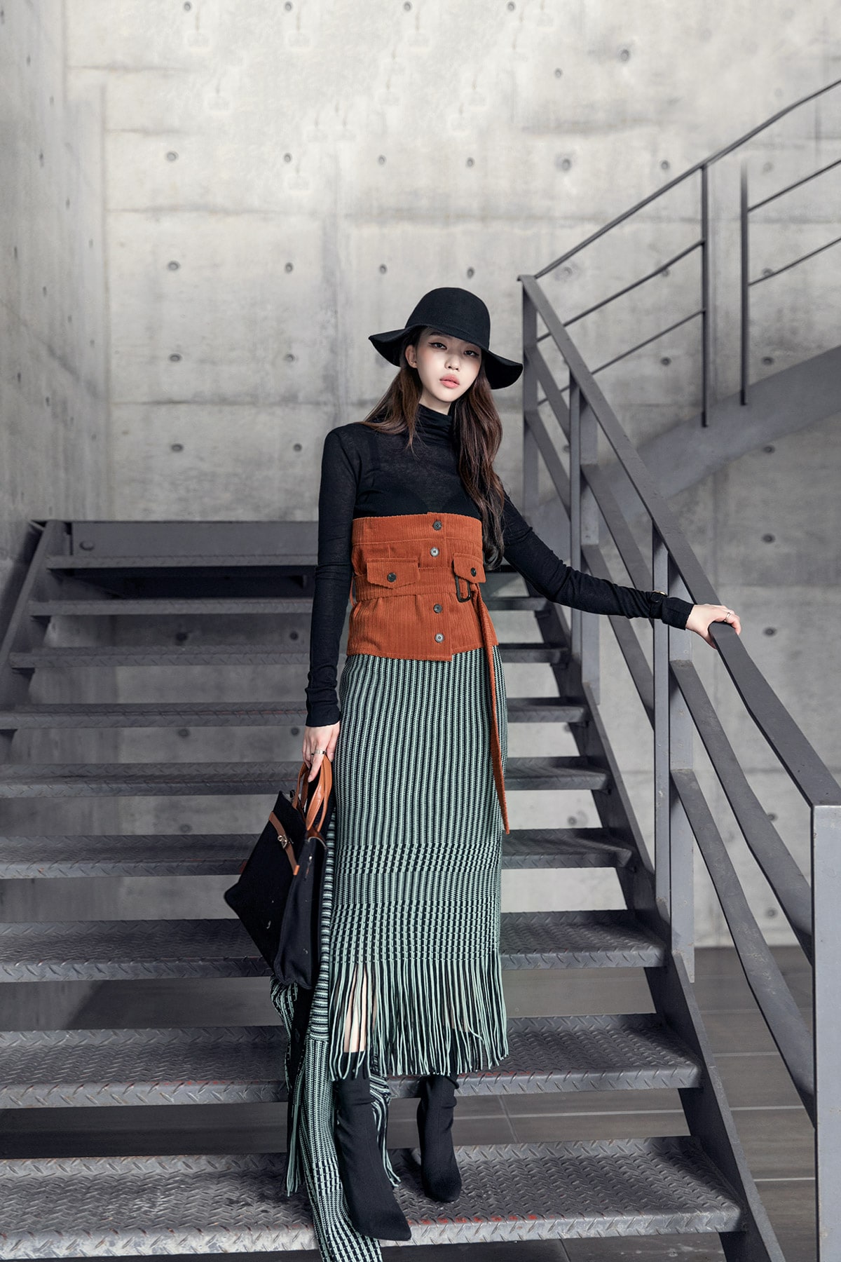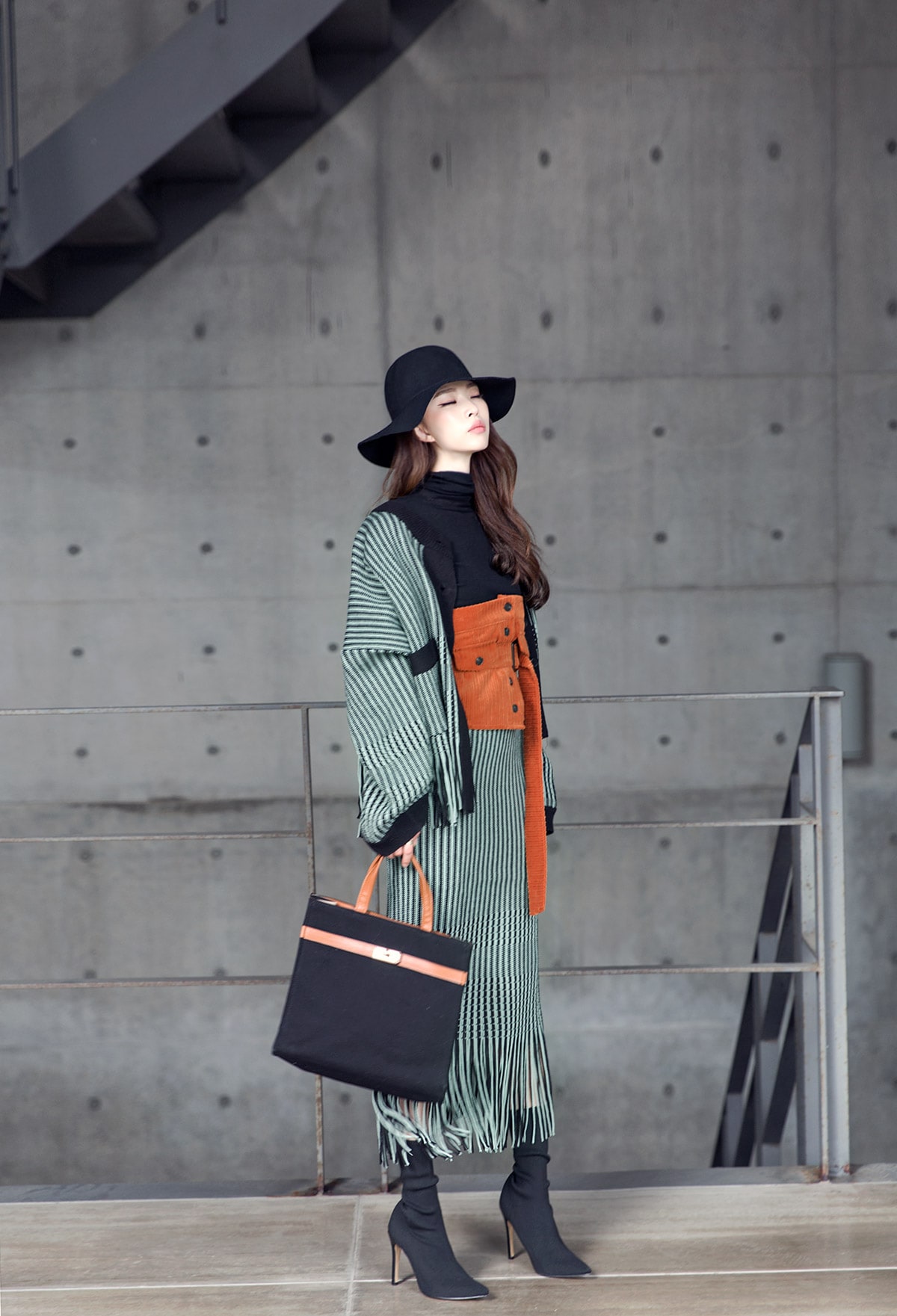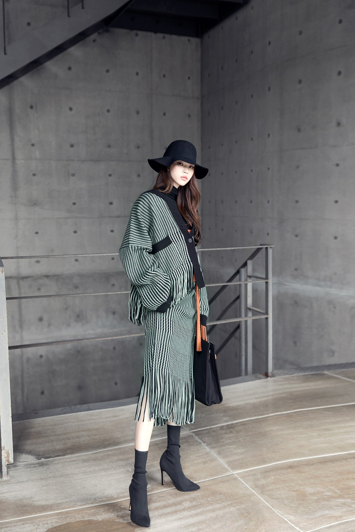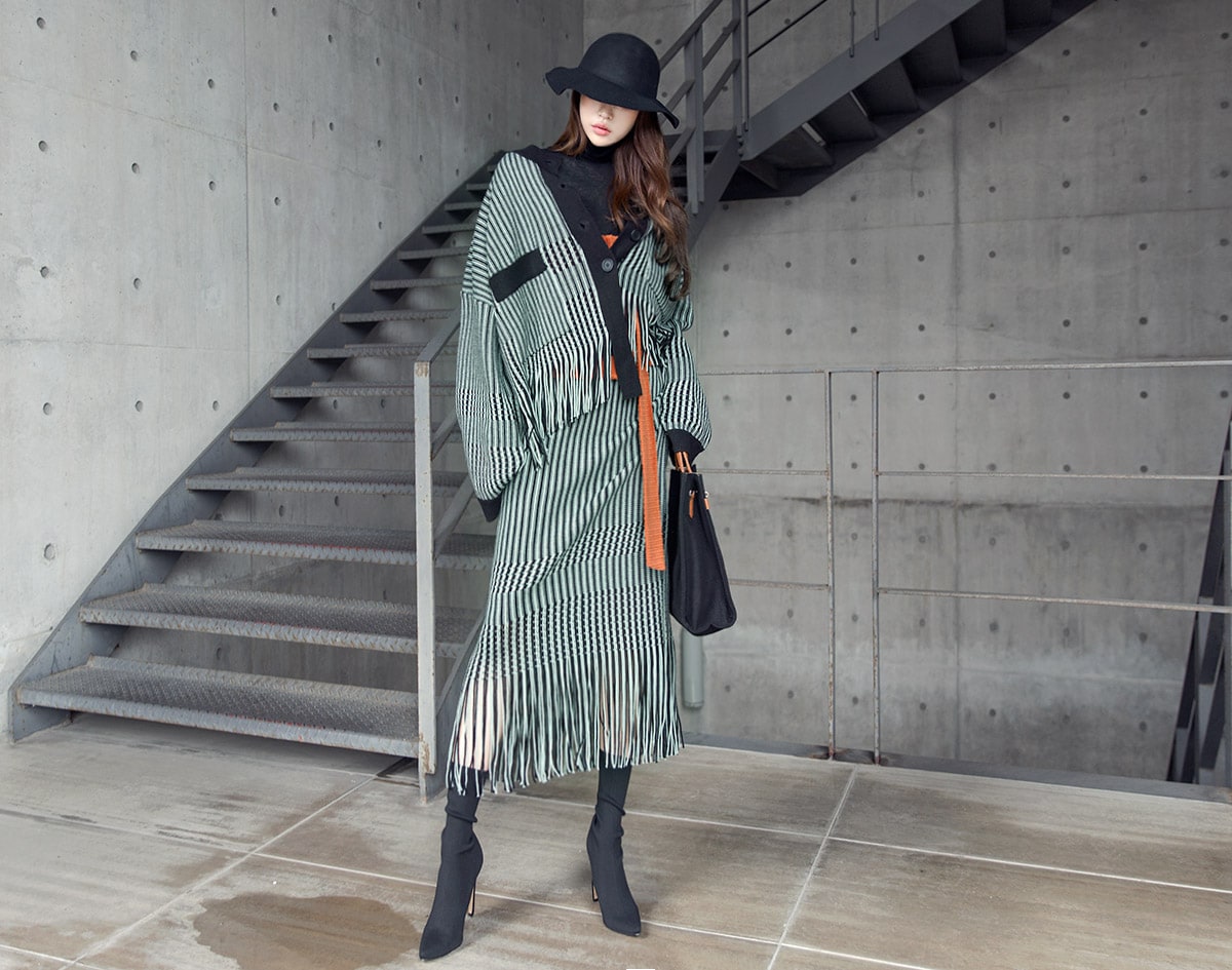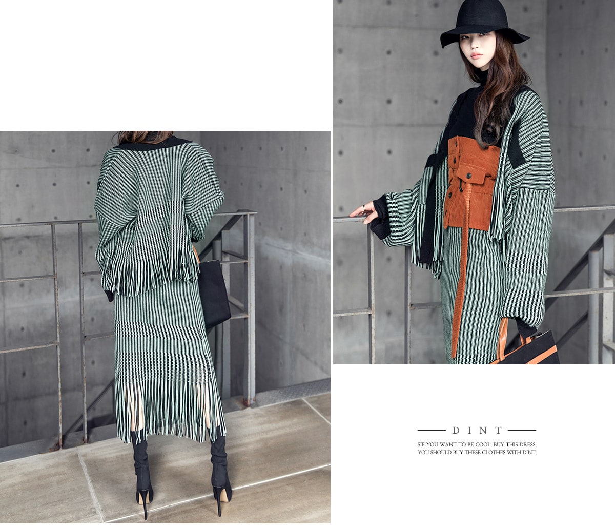 <모델 코디 제품명> SK1772 유니크 수술 컬러 니트 스커트 Mint mix E1795 베이스 라인 폴라 탑 Black E1797 컬러칩 골지 뷔스티에 탑(벨트set) Orange AC-481 모더니즘 울 페도라 햇 Black AJ-3908 링(6개set) Gold A-954 금장 배색 모던 토드백 Black AR-2163 베이스 레그 삭스 힐 Black * 모델이 착용한 뱅글은 스타일리스트 개인소장품입니다