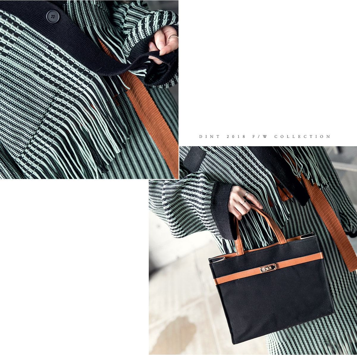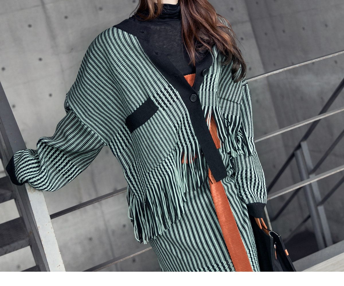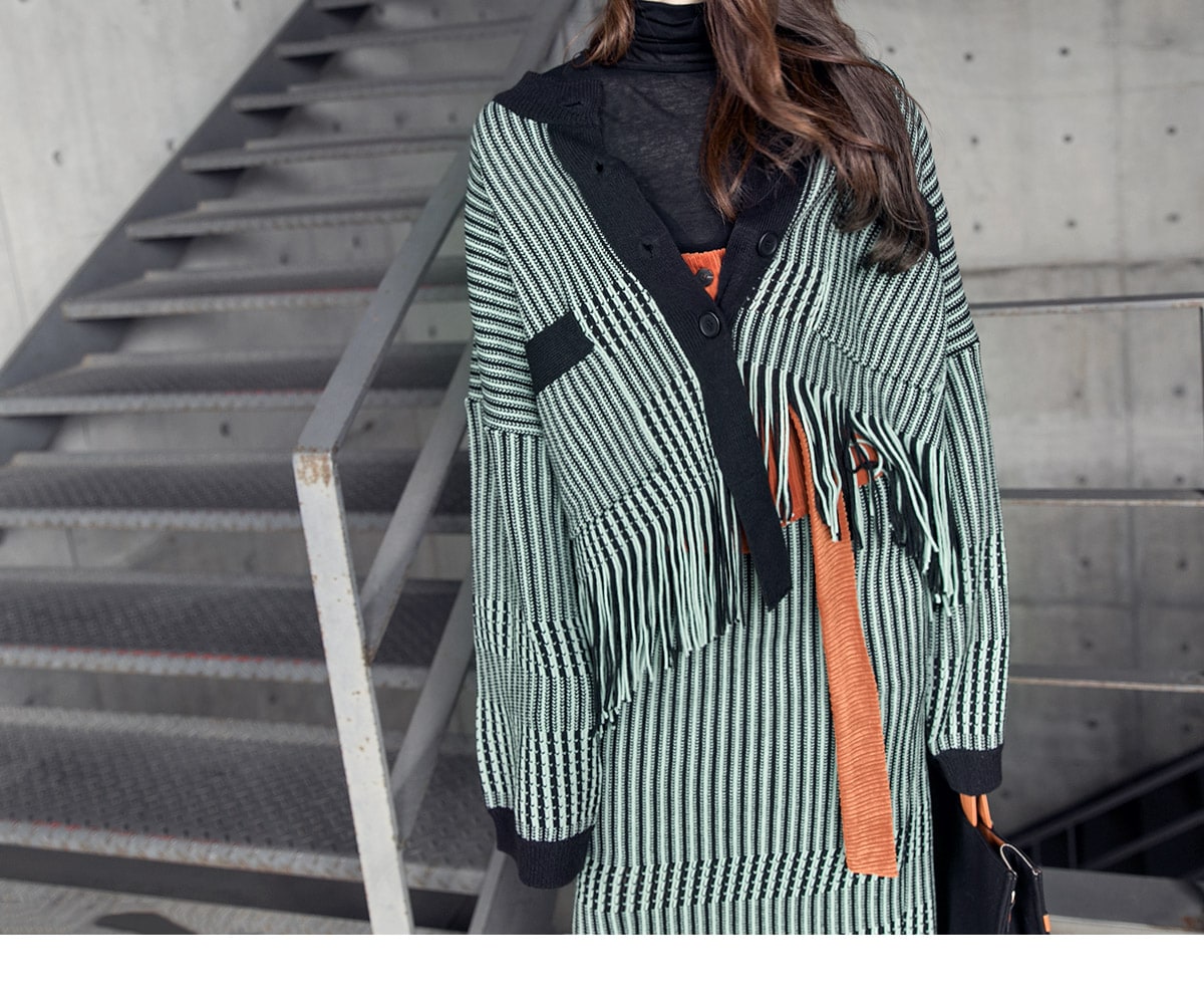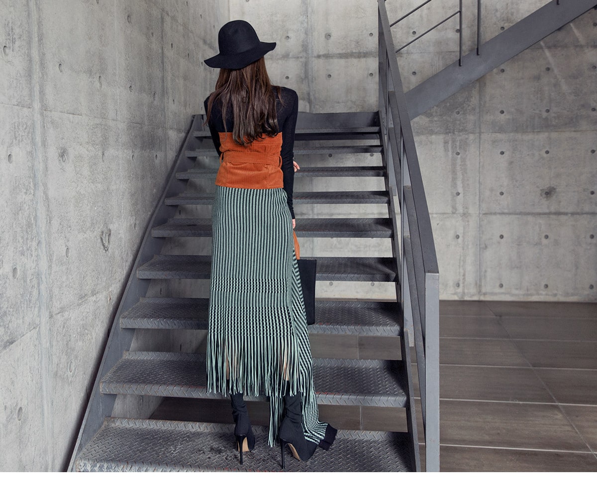 <모델 코디 제품명> SK1772 유니크 수술 컬러 니트 스커트 Mint mix E1795 베이스 라인 폴라 탑 Black E1797 컬러칩 골지 뷔스티에 탑(벨트set) Orange AC-481 모더니즘 울 페도라 햇 Black AJ-3908 링(6개set) Gold A-954 금장 배색 모던 토드백 Black AR-2163 베이스 레그 삭스 힐 Black * 모델이 착용한 뱅글은 스타일리스트 개인소장품입니다