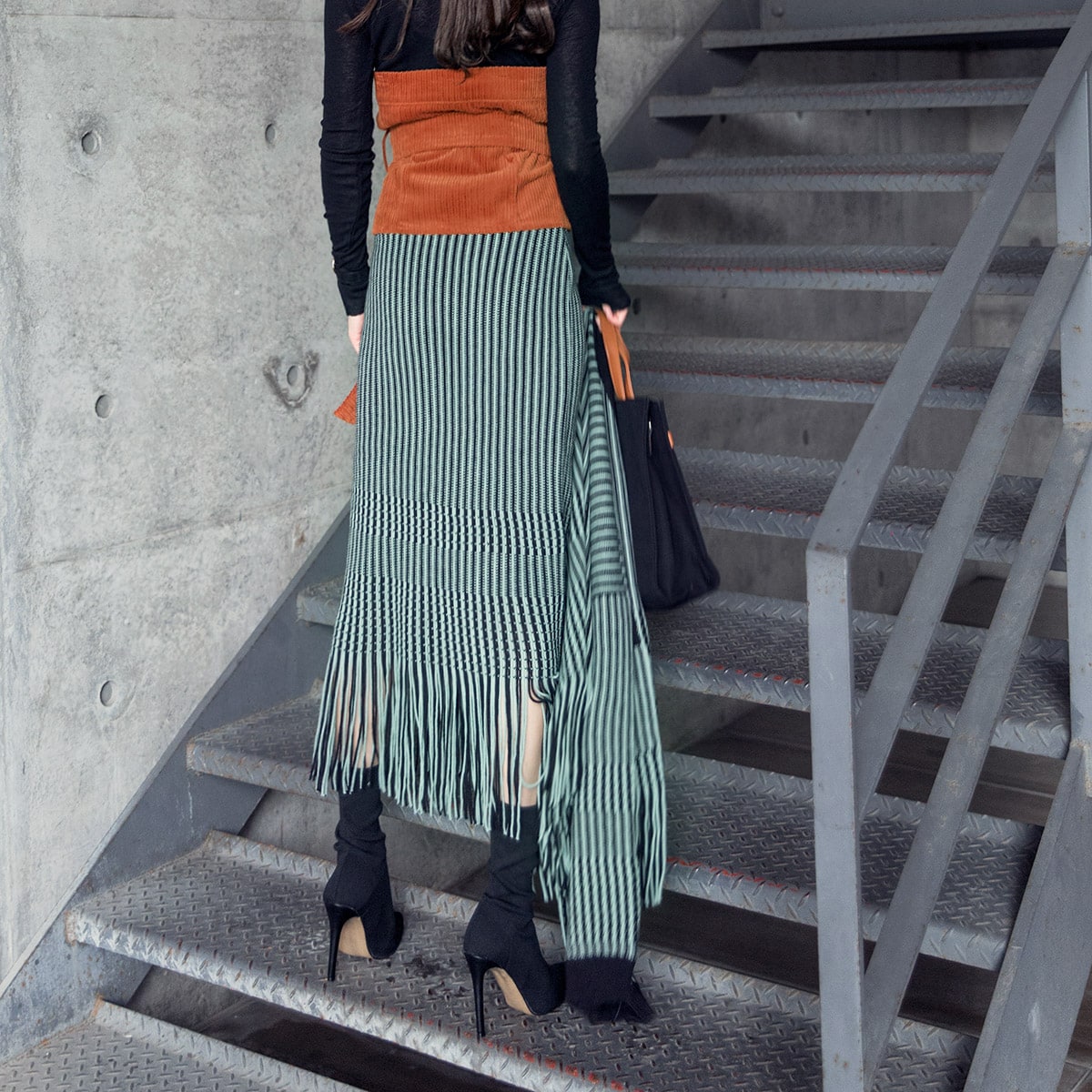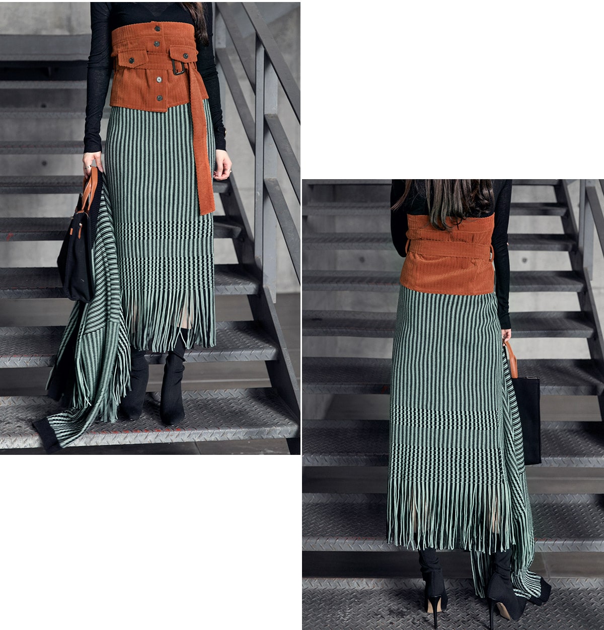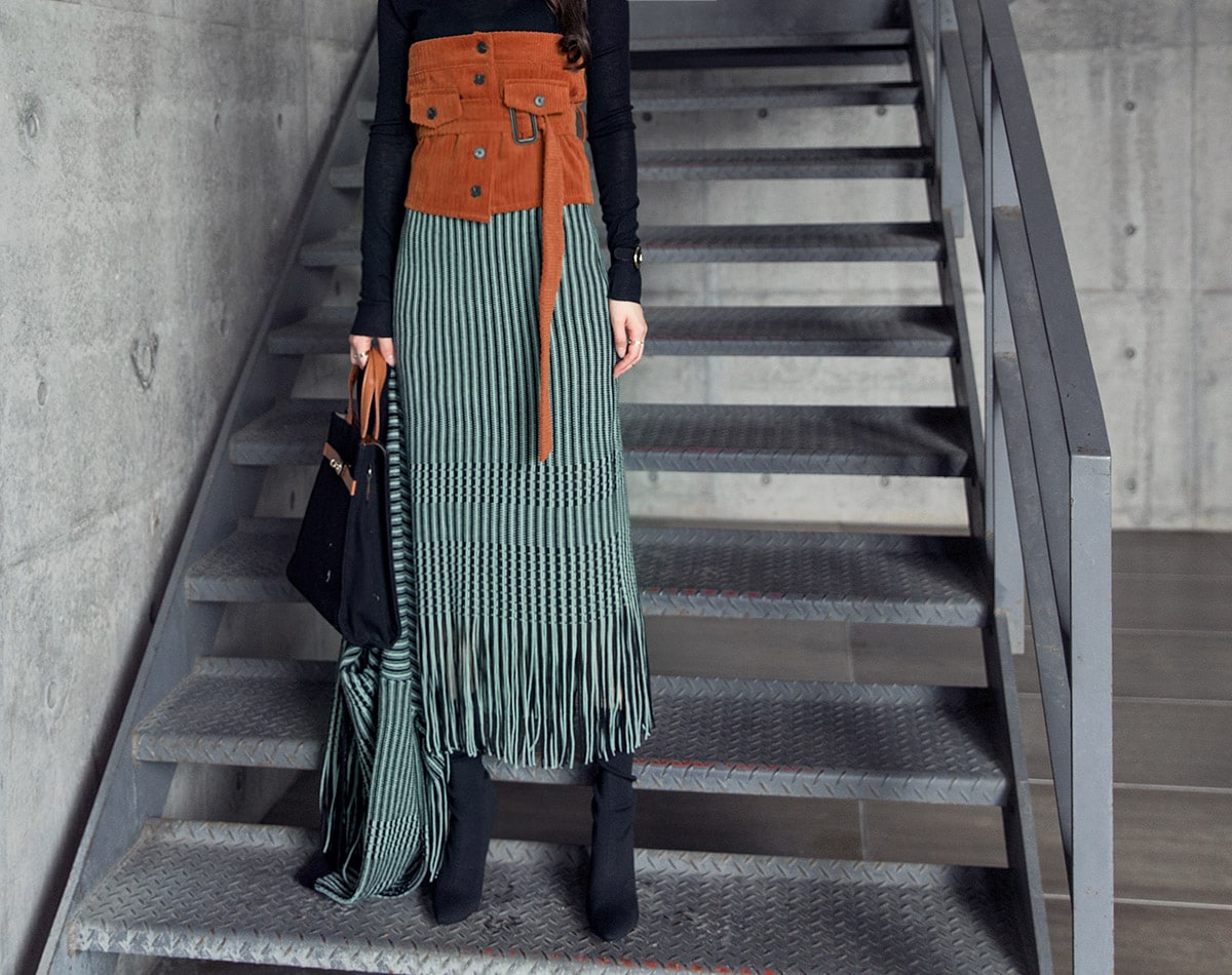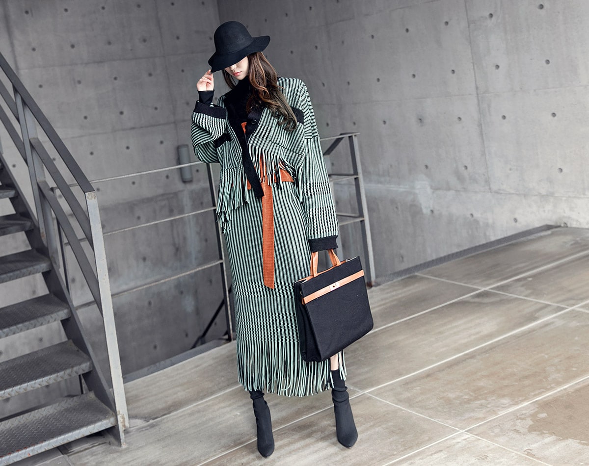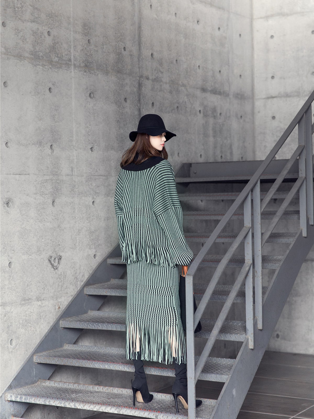 <모델 코디 제품명> SK1772 유니크 수술 컬러 니트 스커트 Mint mix E1795 베이스 라인 폴라 탑 Black E1797 컬러칩 골지 뷔스티에 탑(벨트set) Orange AC-481 모더니즘 울 페도라 햇 Black AJ-3908 링(6개set) Gold A-954 금장 배색 모던 토드백 Black AR-2163 베이스 레그 삭스 힐 Black * 모델이 착용한 뱅글은 스타일리스트 개인소장품입니다