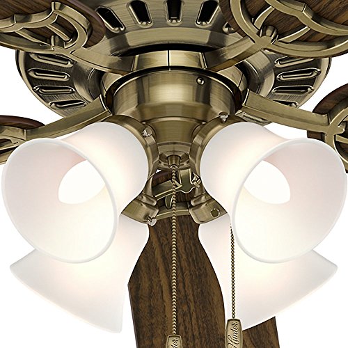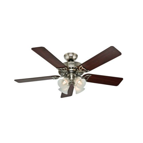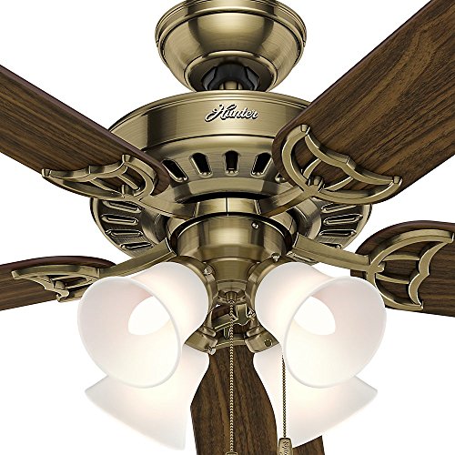 Featuring classic good looks, the Hunter 52-inch Studio series ceiling fan will add beauty and comfort to your home. As functional as it is attractive, this antique brass fan includes an elegant four-light fixture and a reversible five-blade design in Walnut/Medium Oak. Powered by a high performance, Whisper Wind Motor it delivers ultra-powerful air movement with whisper-quiet performance so you get the cooling power you want, without the noise you don't.