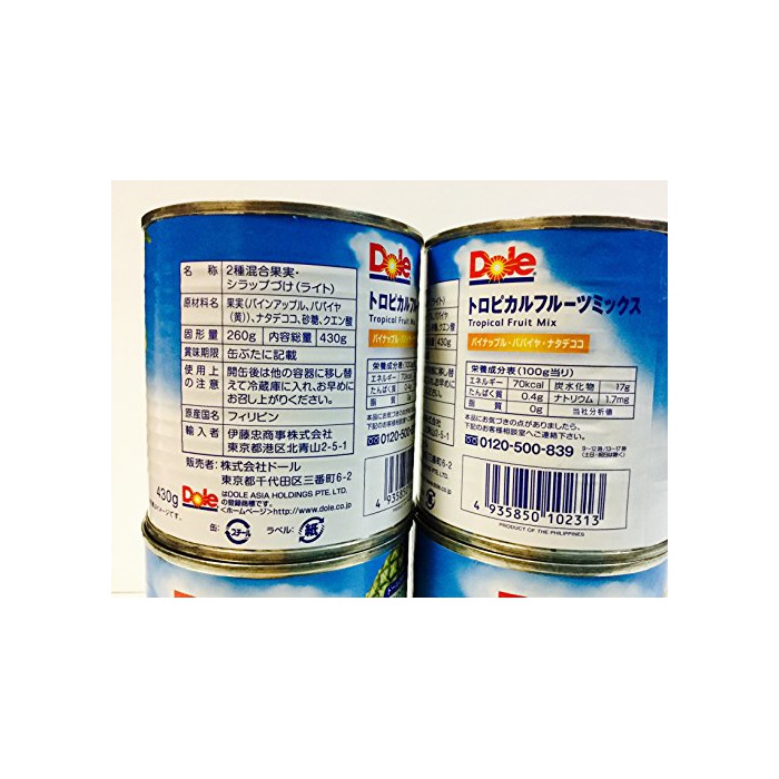 원본상품명: Dole トロピカルフル?ツミックス(パイナップルパパイヤナタデココ) 430g×4缶セット