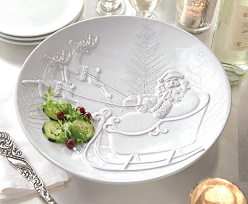 Studio : Mud Pie Publisher : Mud Pie Product Description The perfect complement your holiday entertaining is this Old World Santa serving bowl by Mud Pie. Measuring 14-inches in diameter, this milk glazed terracotta serving piece features a detailed embossed Santa Claus in his sleigh being pulled by reindeer. Simply elegant! 0