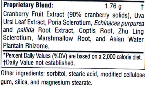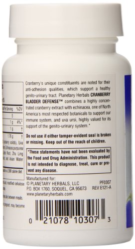 -. Binding : Health and Beauty -. Brand : Planetary Herbals -. Department : Natural Health -. EAN : 0021078103073 -. Feature : Noted for supporting a healthy urinary tract / Combines a highly concentrated cranberry extract with echinacea / Botanical to support the immune system -. IsAdultProduct : 0 -. Label : Planetary Herbals -. LegalDisclaimer : * These statements have not been evaluated by the Food and Drug Administration. This product is not intended to diagnose, treat, cure or prevent any disease. ** Always refer to the manufacturer's label on the product for description, recommended dose and precautions. -. Manufacturer : Planetary Herbals -. Model : 021078103073 -. MPN : 021078103073 -. NumberOfItems : 1 -. PackageQuantity : 1 -. PartNumber : 021078103073 -. ProductGroup : Health and Beauty -. ProductTypeName : HEALTH_PERSONAL_CARE -. PublicationDate : 2013-08-20 -. Publisher : Planetary Herbals -. ReleaseDate : 2015-06-22 -. Size : 30 Tabs -. Studio : Planetary Herbals -. Title : Planetary Herbals Cranberry Bladder Defense Tablets, 30 Count -. UPC : 021078103073
