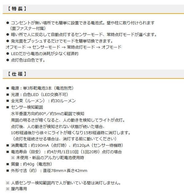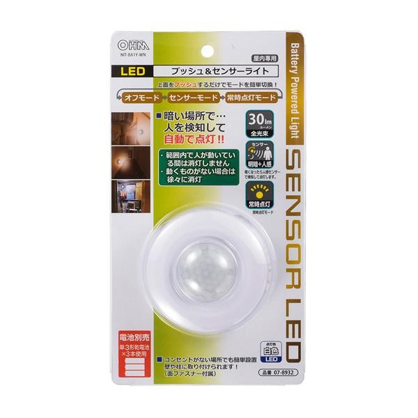 暗所での人感センサー自動点灯モードと常時点灯モードが選べます。発行面をプッシュするだけでモードを簡単切替可能! 製造国:中国 付属品:面ファスナー×1セット取扱説明書兼保証書(保証期間:1年間) ※サプライヤー直送品 ご注文後2~3営業日後の出荷となります【商品名】オーム電機 OHM LEDプッシュ&センサーライト NIT-BA1Y-WN