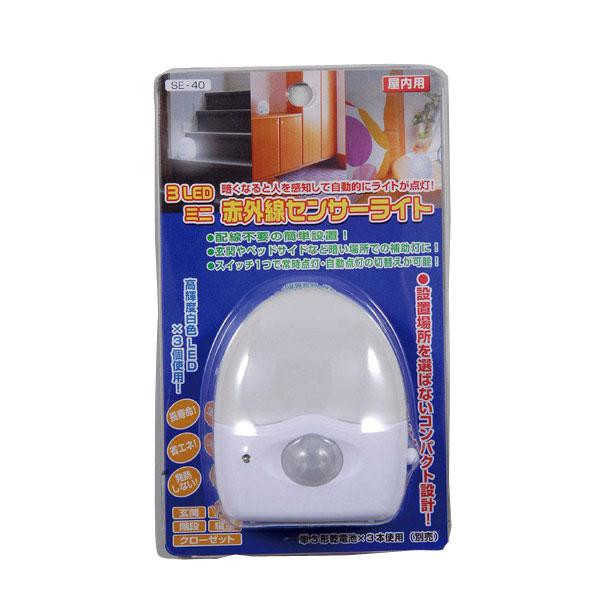 | 仕様 | 点灯方法:常時点灯・明暗&人感センサー 光源:高輝度白色LED×3灯 使用電源:単3形乾電池×3本(別売) 電池寿命/待機時:連続 約150日間 ・自動点灯:約60日間 (1日10回点灯時)・常時点灯:連続 約35時間(アルカリ乾電池使用時) |