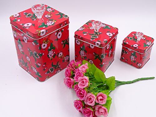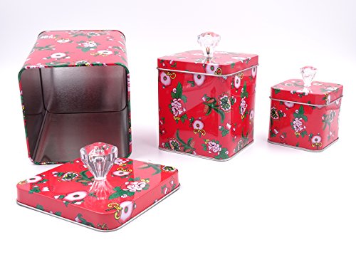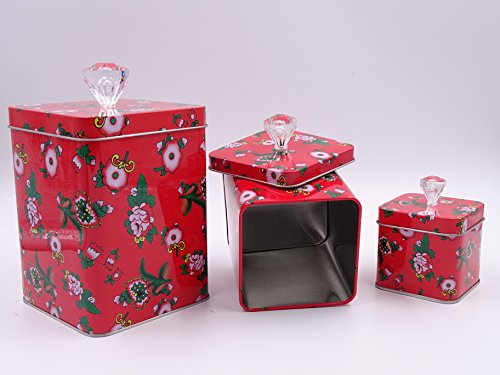 Adorable Red Set Of 3 Cookie Storage Tins, Shabby Chic, With Elegant Floral Design and Crystal Knobs …