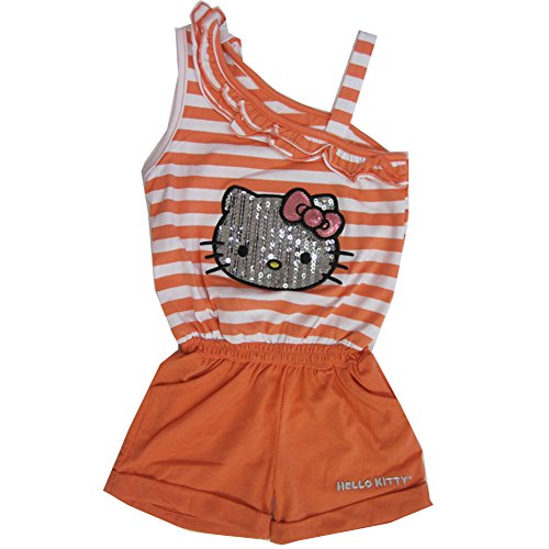 Simply adorable, perfect romper for your little girl due to its cute applique from Hello Kitty! Cozy, soft romper features an asymmetrical top with tailored ruffled shoulder and orange white striped pattern. A glittery sequined applique brings out a cute, girly flair. Front pockets and elasticated waistline.Feature