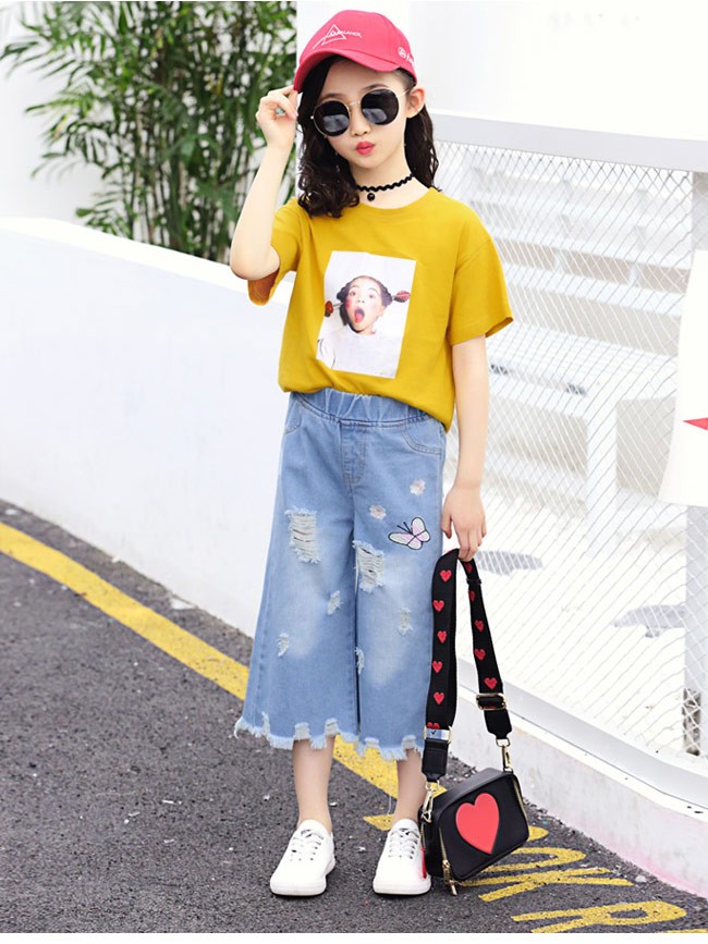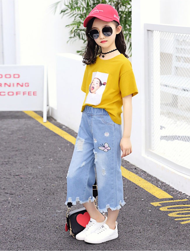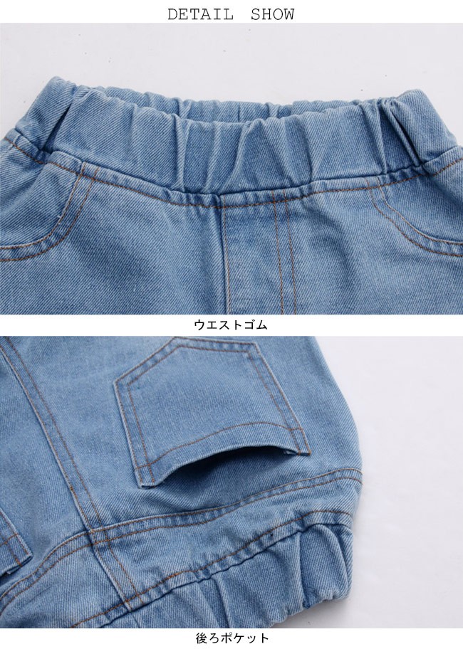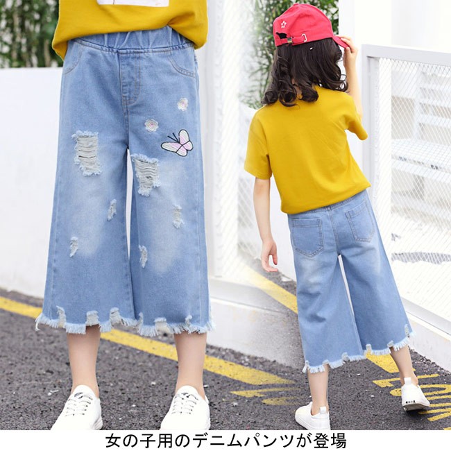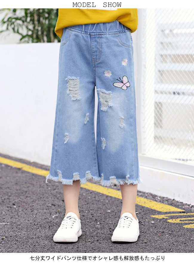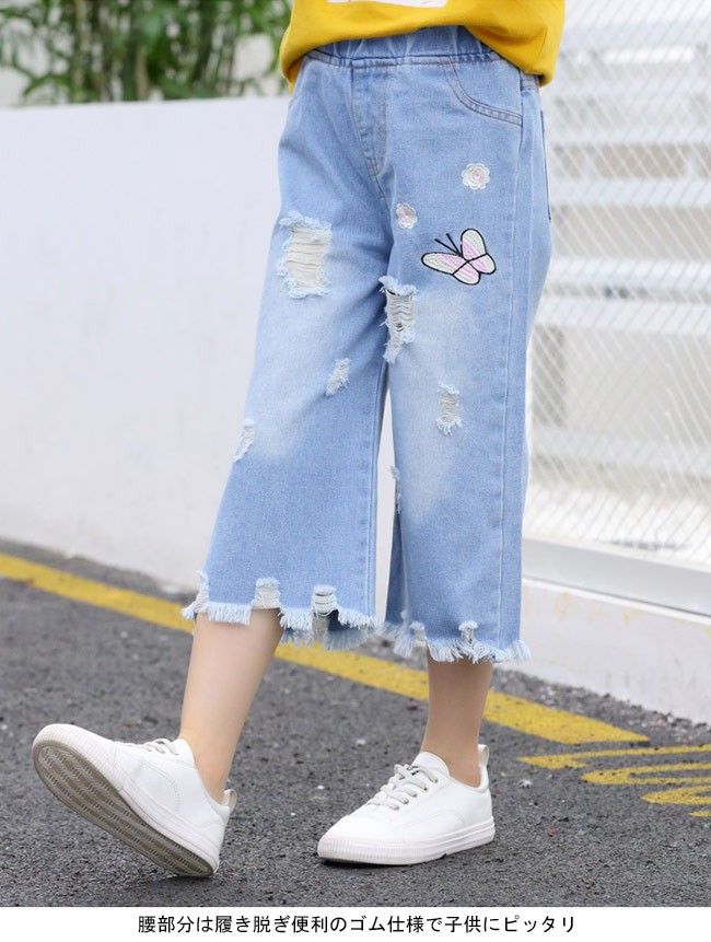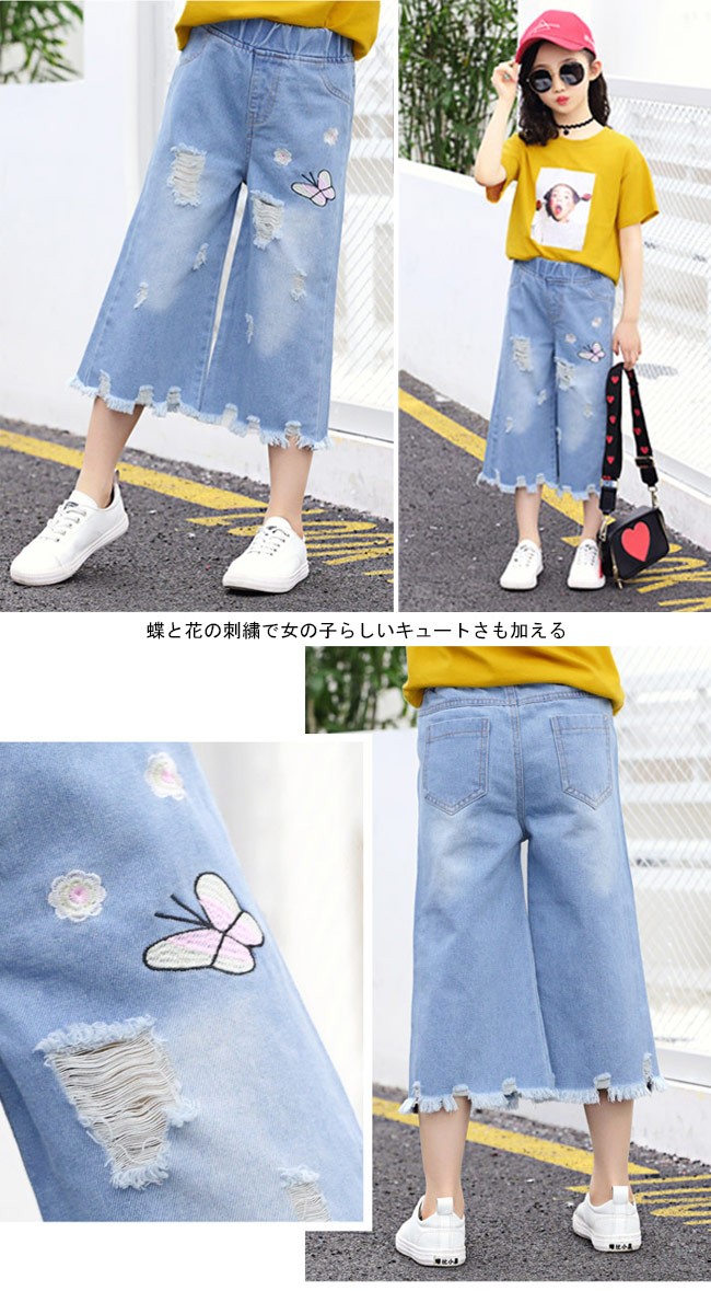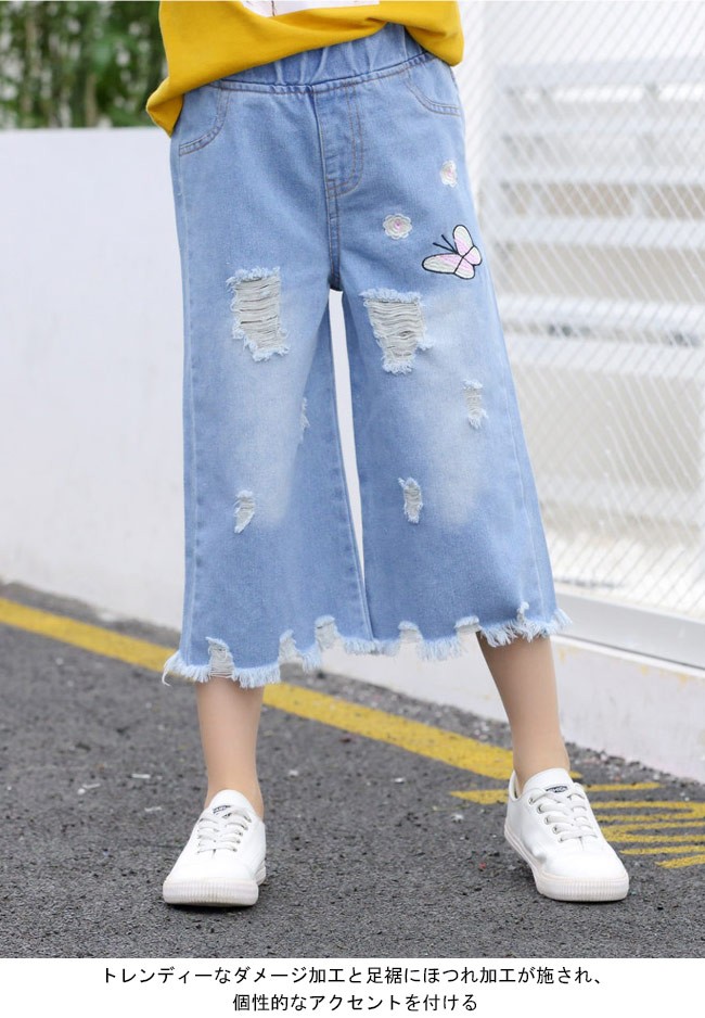 デニムパンツ 女の子 ワイドパンツ ウエストゴム 子供用 七分丈パンツ 女児 ジーパン ダメージ加工 ジュニア クロップドパンツ kids女の子用のデニムパンツが登場七分丈ワイドパンツ仕様でオシャレ感も解放感もたっぷりトレンディーなダメージ加工と足裾にほつれ加工が施され、個性的なアクセントを付ける蝶と花の刺繍で女の子らしいキュートさも加える腰部分は履き脱ぎ便利のゴム仕様で子供にピッタリカラー:写真色素材 綿混紡サイズ(cm) 110 120 130 140 150 160110 総丈52 ヒップ70120 総丈57 ヒップ73130 総丈61 ヒップ76140 総丈66 ヒップ79150 総丈70 ヒップ82160 総丈75 ヒップ86ご注意:※サイズは平置きサイズです。素人採寸ですので、若干の誤差がございます、ご了承ください。