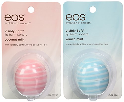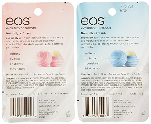 eos Visibly Soft(TM) Lip Balm, enriched with natural conditioning oils, moisturizing shea butter and antioxidant vitamins C & E, nourishes for immediately softer, more beautiful lips. *99% natural *Long-lasting moisture for immediately softer, more beautiful lips *Shea butter & vitamins C & E *Smoothes on clear *Precisely glides on lips *Twist-off top *Petrolatum-free *Paraben-free *Gluten-free *Phthalate-free *0.25 oz each sphere.Feature
