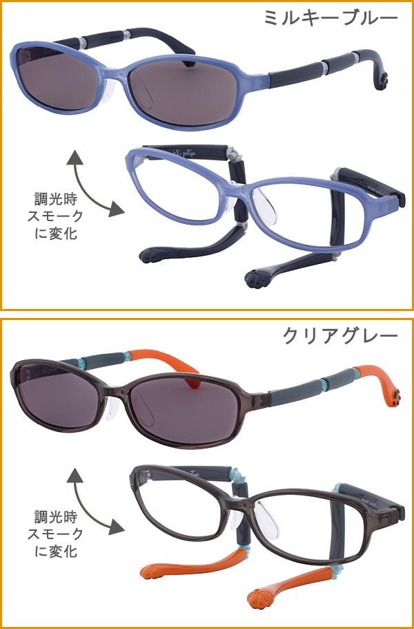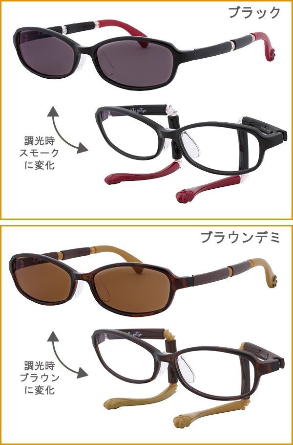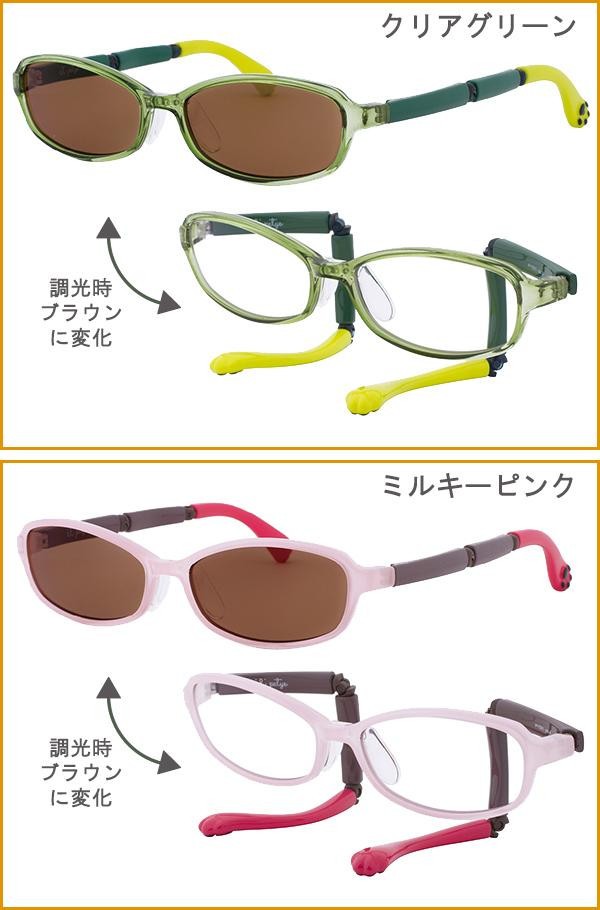 | 紫外線の量によって色が変わる調光レンズを採用しているので、外に出るとキレイに発色し、眩しさを軽減して快適に過ごせます。テンプルに関節があり、曲げていくことで自立することができます。テンプルの端は猫足になっているので自立する姿もとってもキュート☆ |