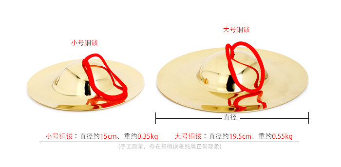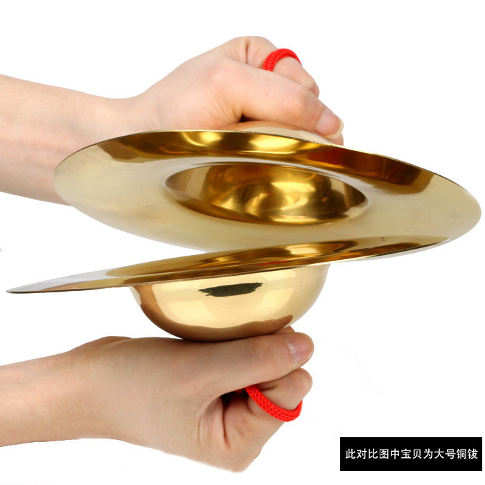 Product features: A straw hat?shaped,?two?cymbals?leaves?the Yin and Yang,?two?cymbalscrashing?noise?performance.?Small cymbals,?percussion,?copper,?20 cm in diameter.?Cymbals,?small cymbals?and these two instruments?that allthe birds?in the?fruition?when?the sound of?flying?wings.?A?Purdue beingsthat?Buddhism,?believes that all the world?people,?as long as the?spiritualworld,?converted to Buddhism,?we can?airness,?become a Buddha immediately. Product?introduction: Name:?cymbals Material:?Copper Size: small?cymbals?diameter of about?15cm Large?cymbal?about 19.5cm in diameter Weight:?small,?large?cymbals?cymbal?about 0.35kg?to about 0.55kg |