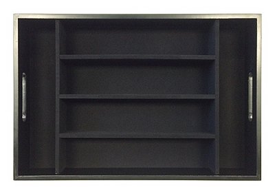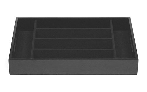 Studio : Mountain Woods Publisher : Mountain Woods Product Description Organize silverware and other kitchen tools with this elegant drawer tray featuring a luxurious felt interior. The six compartments are big enough to store eight of your finest six piece place settings. Place it on a counter top or slide it in a drawer to keep your utensils organized. This handy organizer tray is made of durable pressed wood and fits in most average sized kitchen drawers. Measures 18" x 12" x 2.5". *Care Instructions: This product is not suitable for the dishwasher. Wipe with a clean, water dampened cloth to remove any dirt or dust. Do not immerse in water. 0