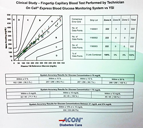-. Binding : Health and Beauty -. Brand : On Call Express -. EAN : 0682607557295 -. Feature : No Coding Required-Auto Calibration circuitry inside every strip / Less Pain! Only a 0.4 microliter sample required with 4 second results / Reliable Clinically Proven Accuracy / Can test from Alternate sites like Palm and Forearm / Meter provides Audible Fill detection & Allows for a 2nd drop of blood to be added within 3 seconds to avoid wasted strips! (Meter not included in this listing) -. IsAdultProduct : 0 -. Label : Acon -. Manufacturer : Acon -. MPN : G13510D -. PackageQuantity : 4 -. PartNumber : G13510D -. ProductGroup : Health and Beauty -. ProductTypeName : HEALTH_PERSONAL_CARE -. Publisher : Acon -. Studio : Acon -. Title : On Call Express Blood Glucose Diabetic Test Strips- 200 count Value Bundle (4boxof50) -. UPC : 682607557295