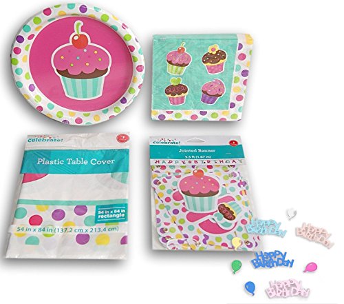 Girls' Pretty Cupcake Party Supplies Set Kit Plates, Napkins, Table Cover Tableware, Confetti Kit for 20 and Jointed Banner